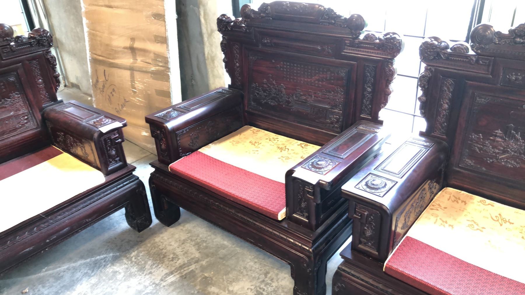 MAHOGANY FINISH ASIAN MOTIF ARMCHAIR 43" W