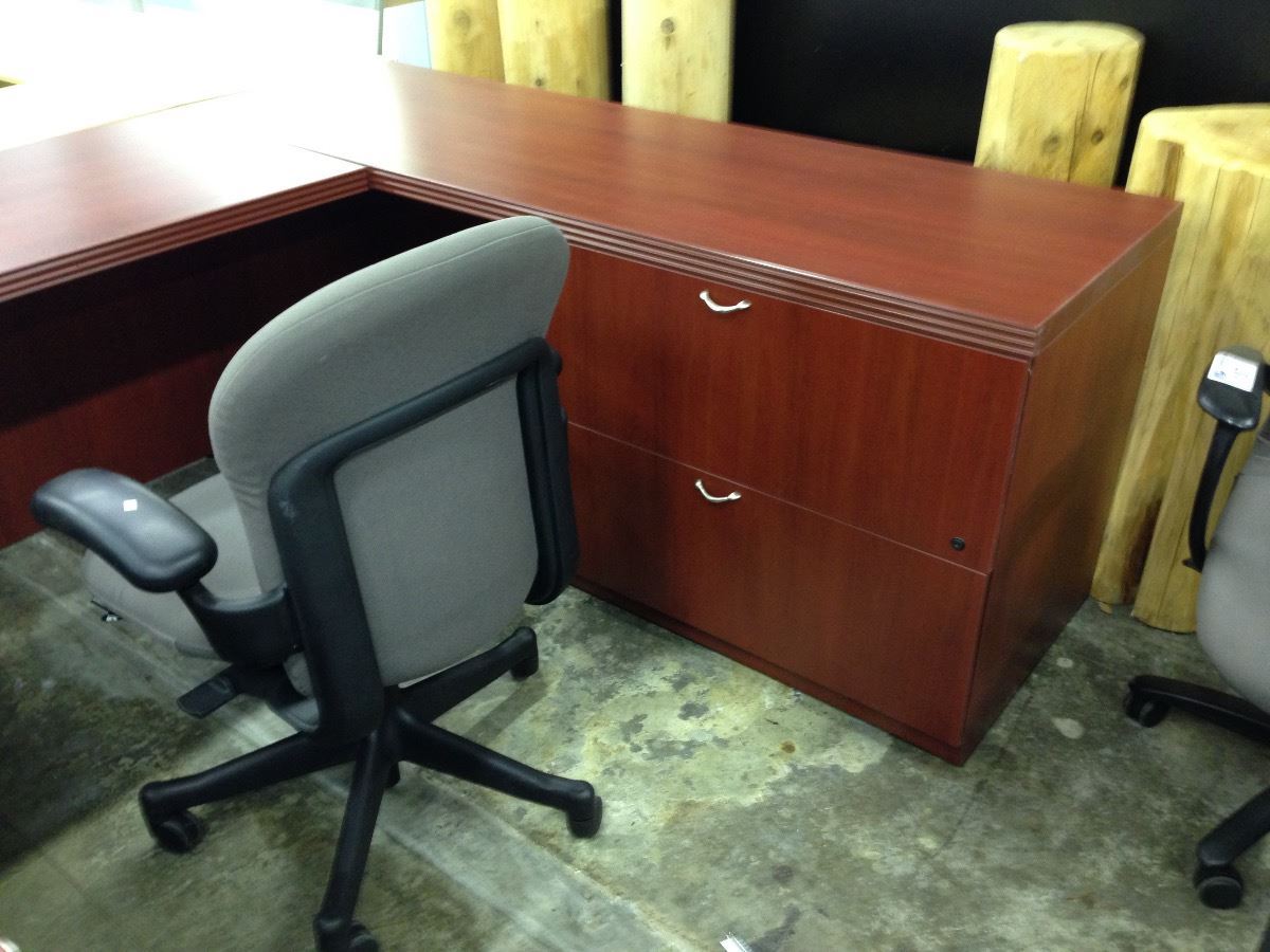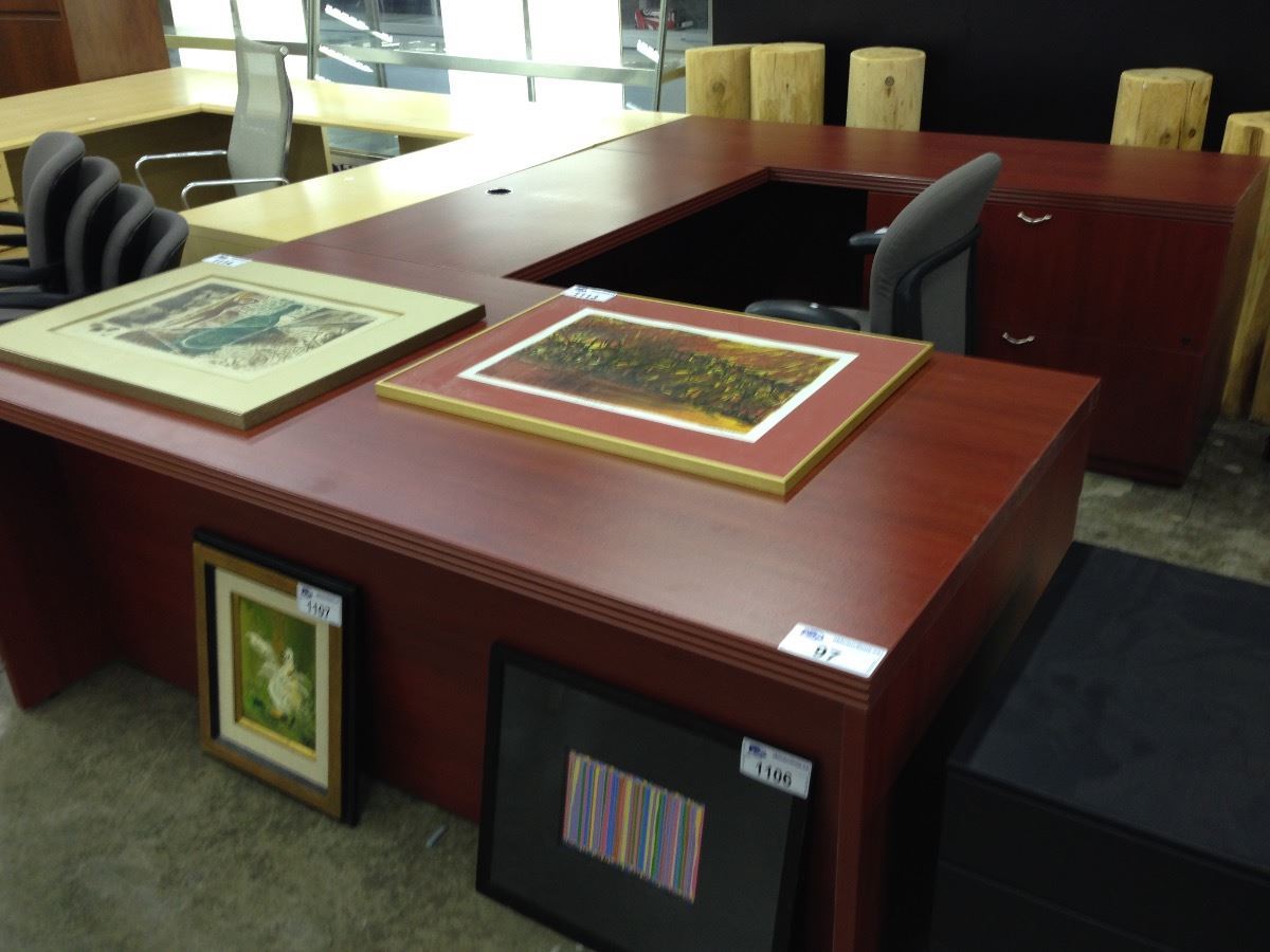MAHOGANY FLUTED EDGE U-SHAPE OFFICE SUITE WITH DESK, CREDENZA AND BRIDGE