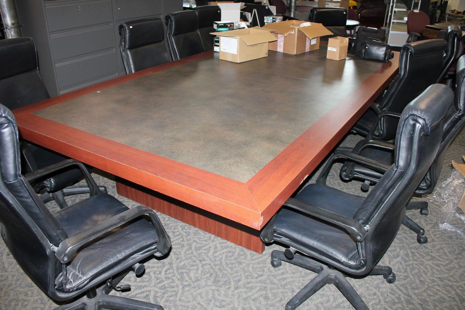 MAHOGANY FRAMED INLAYED 12FT BOARDROOM TABLE (EXPANDABLE TO 18FT)