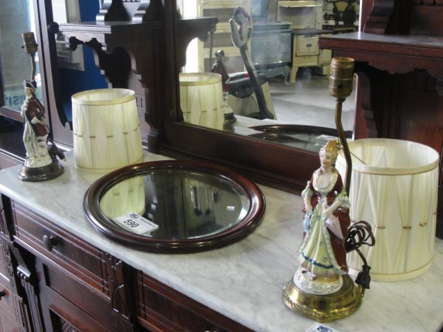 MAHOGANY FRAMED OVAL MIRROR AND 2 PORCELAIN FIGURAL TABLE LAMPS