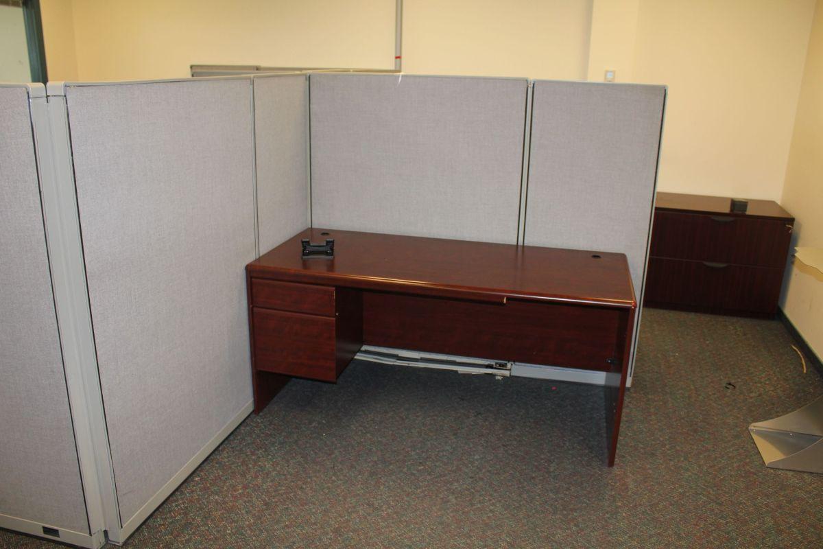MAHOGANY / GREY 4 PERSON WORKSTATION AND MISC. OFFICE FURNITURE
