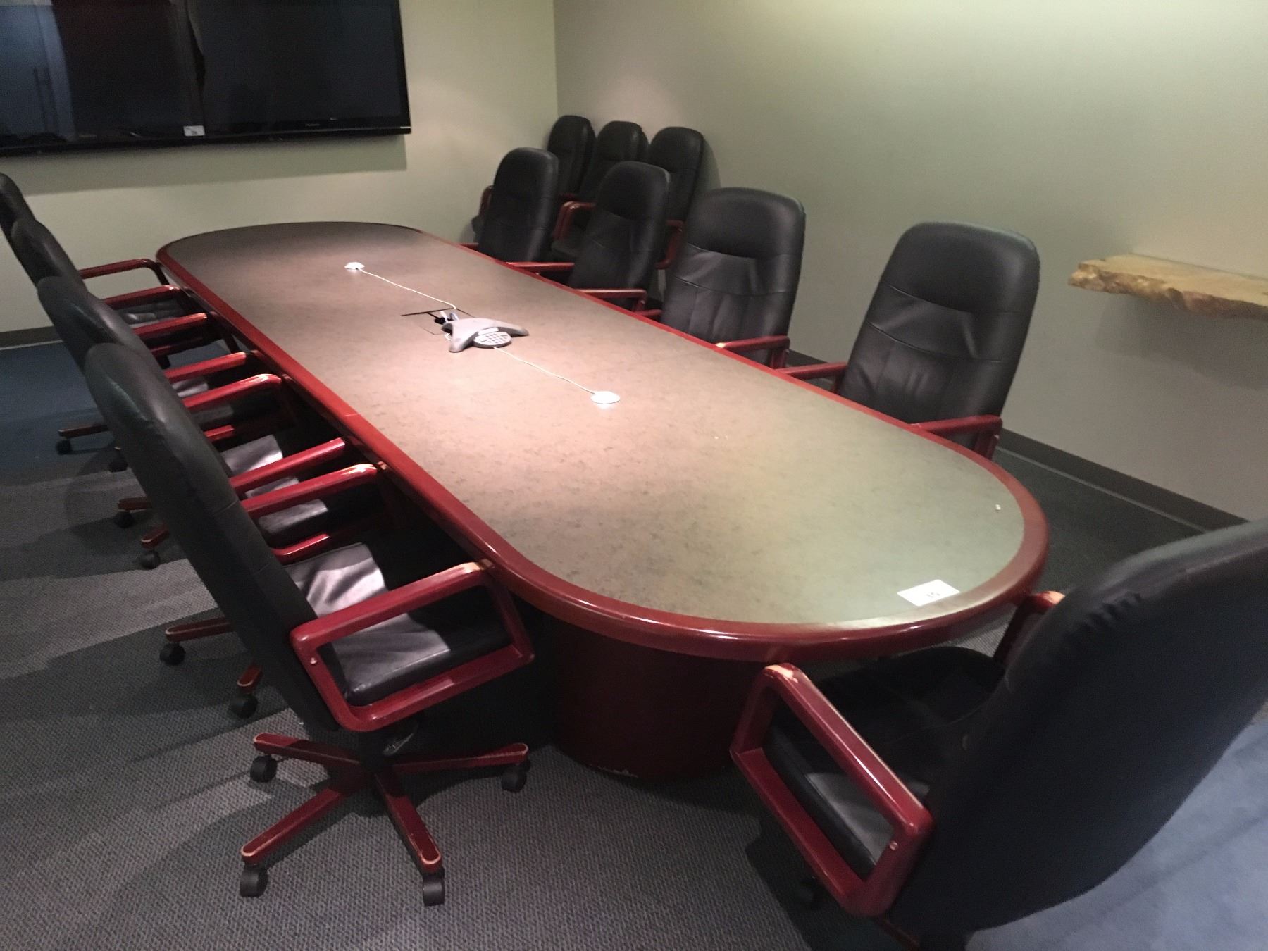 MAHOGANY INLAYED 18' BOARDROOM TABLE C/W 12 BLACK LEATHER HIBACK CHAIRS AND MATCHING WALL MOUNT CONFERENCE BOARD