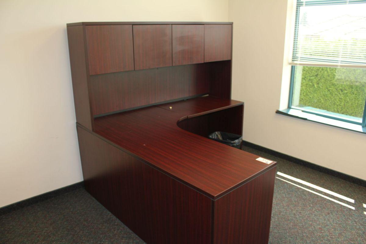 MAHOGANY L-SHAPED DESK WITH HUTCH