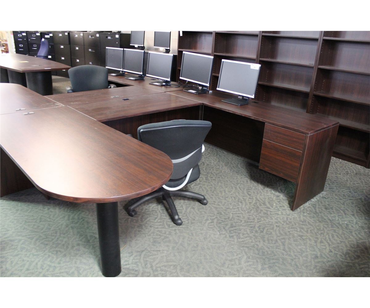MAHOGANY U-SHAPE EXECUTIVE DESK RH W/ 3 DRAWER PEDESTAL