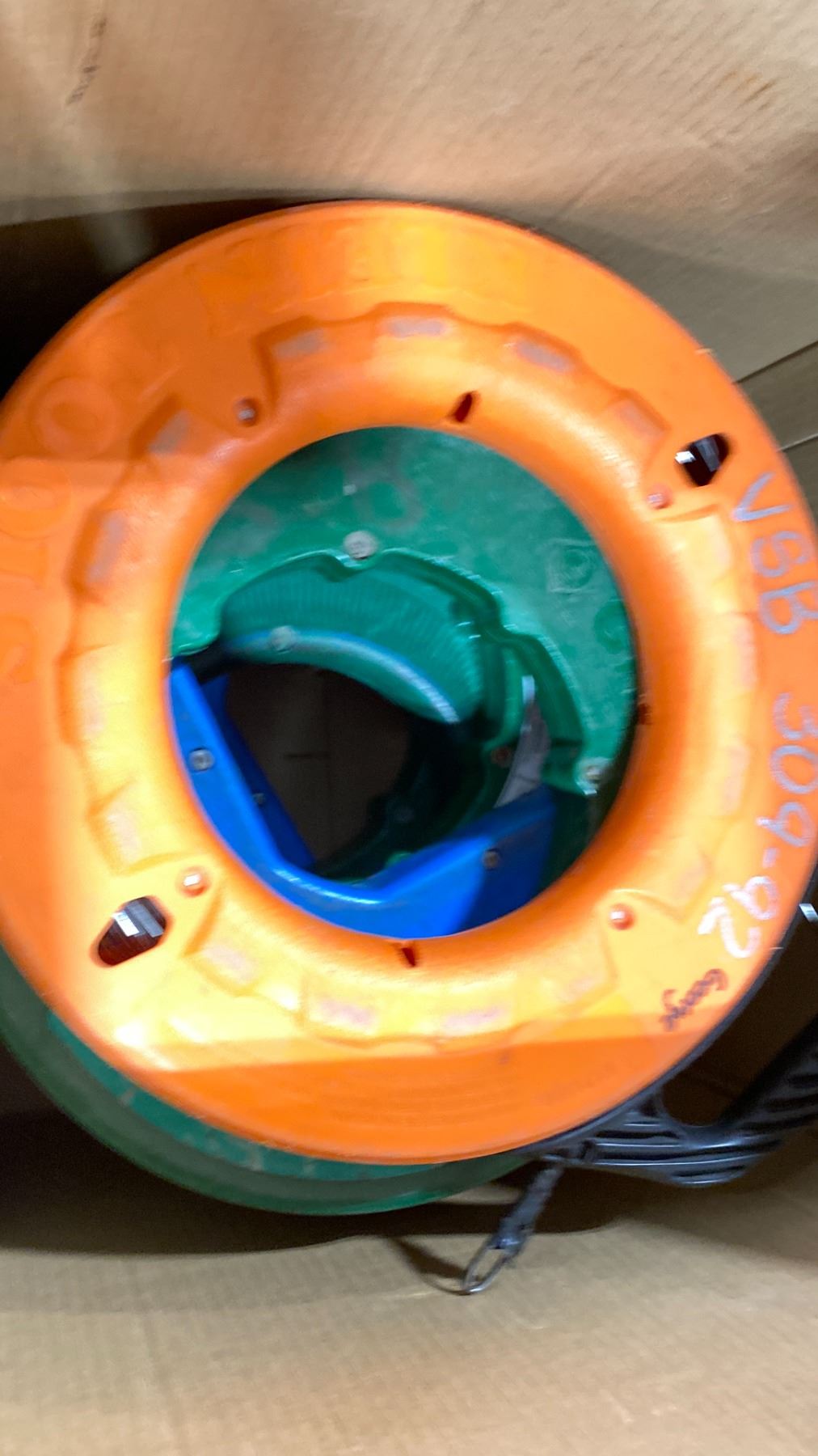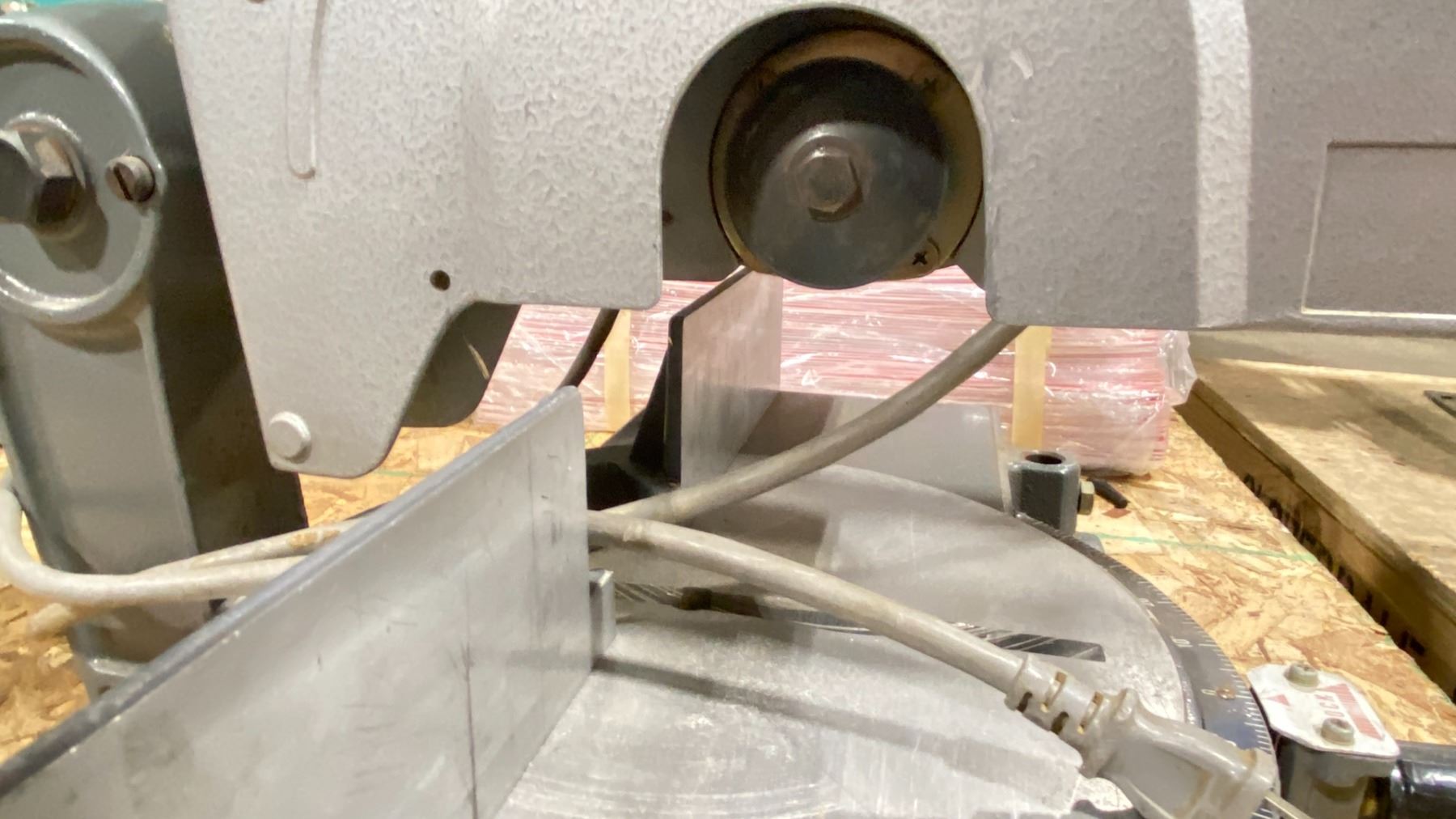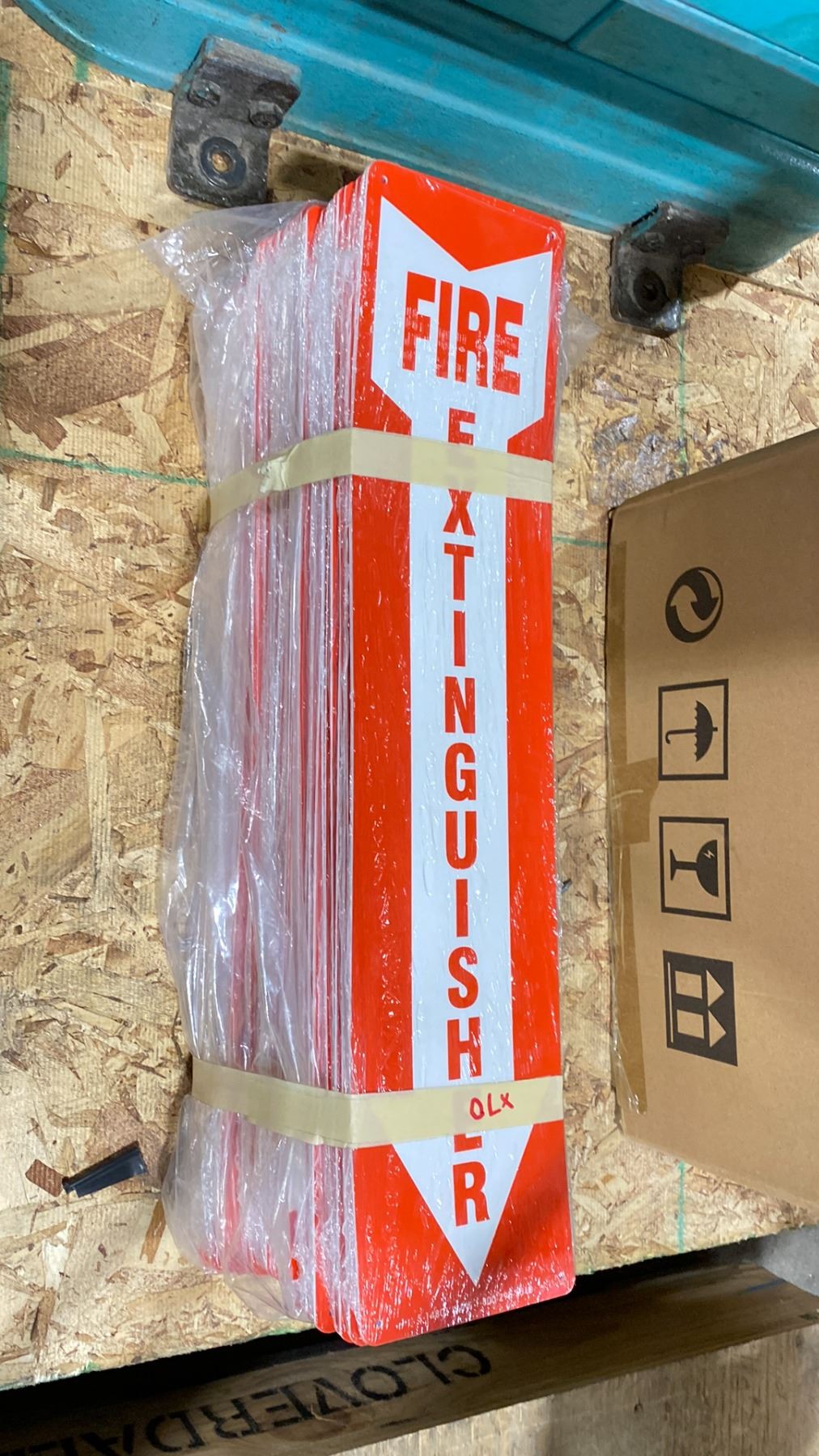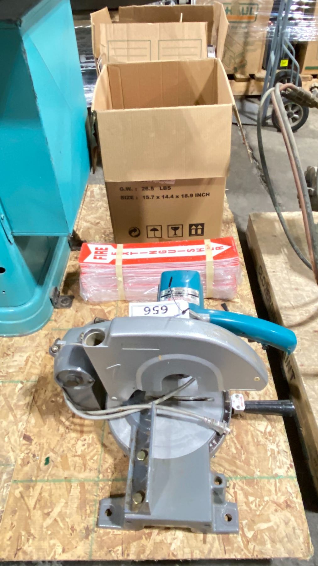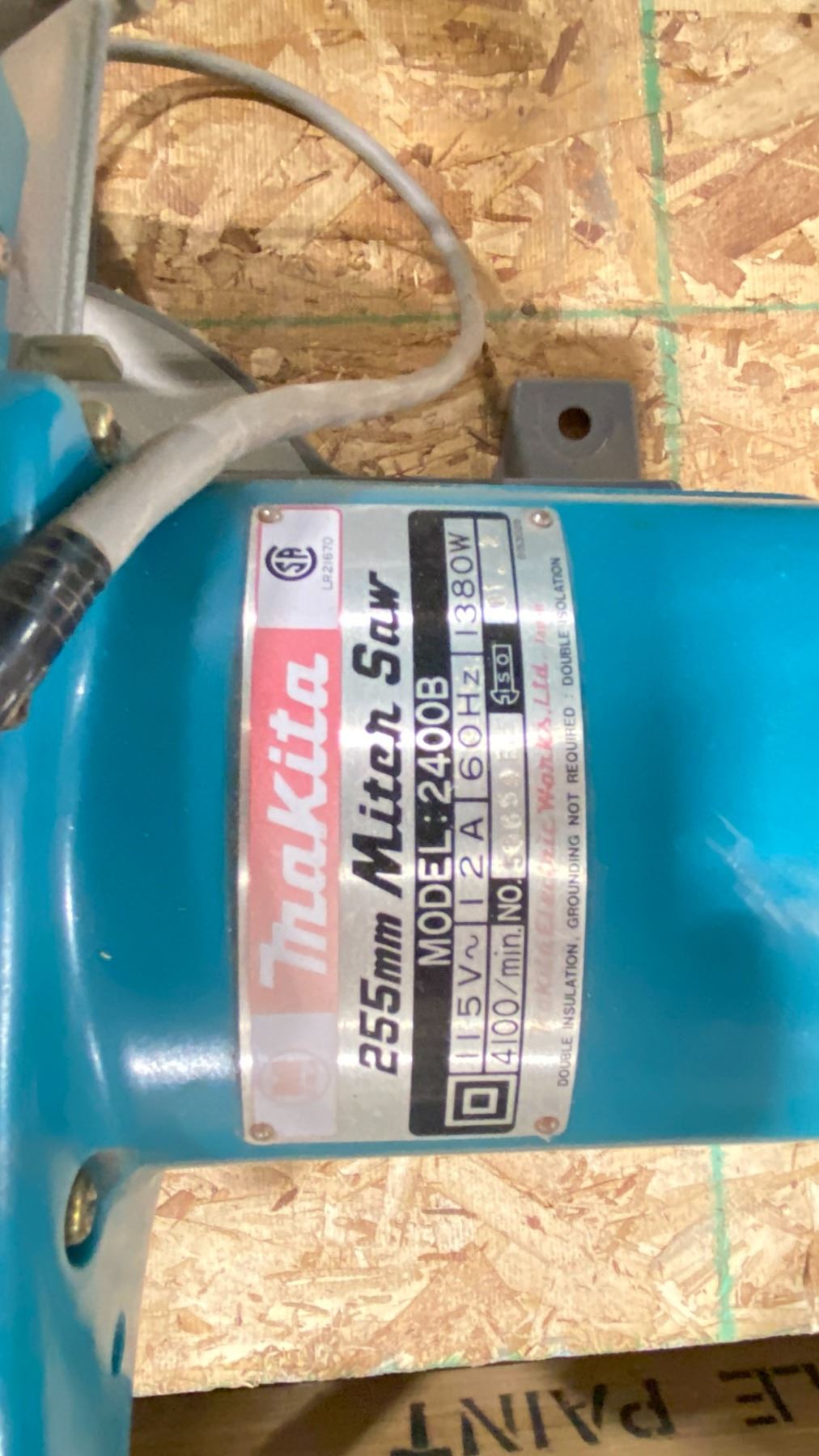MAKITA 2400B MITER SAW, STACK OF FIRE EXTINGUISHER SIGNS & BOX OF ASSORTED STEEL FISH TAPE