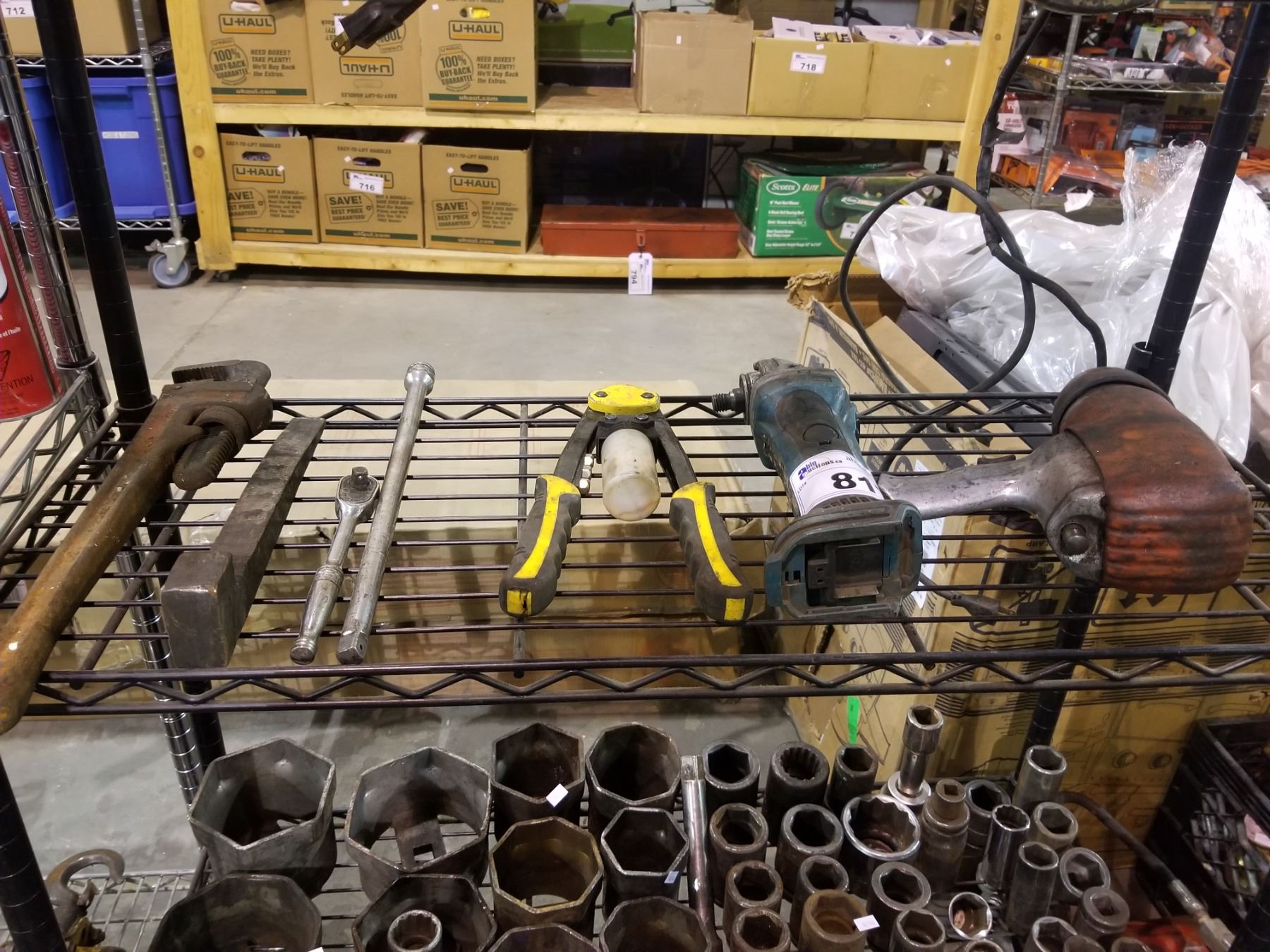 MAKITA ANGLE GRINDER, PIPE WRENCH, ASSORTED WRENCHES, IMPACT GUN