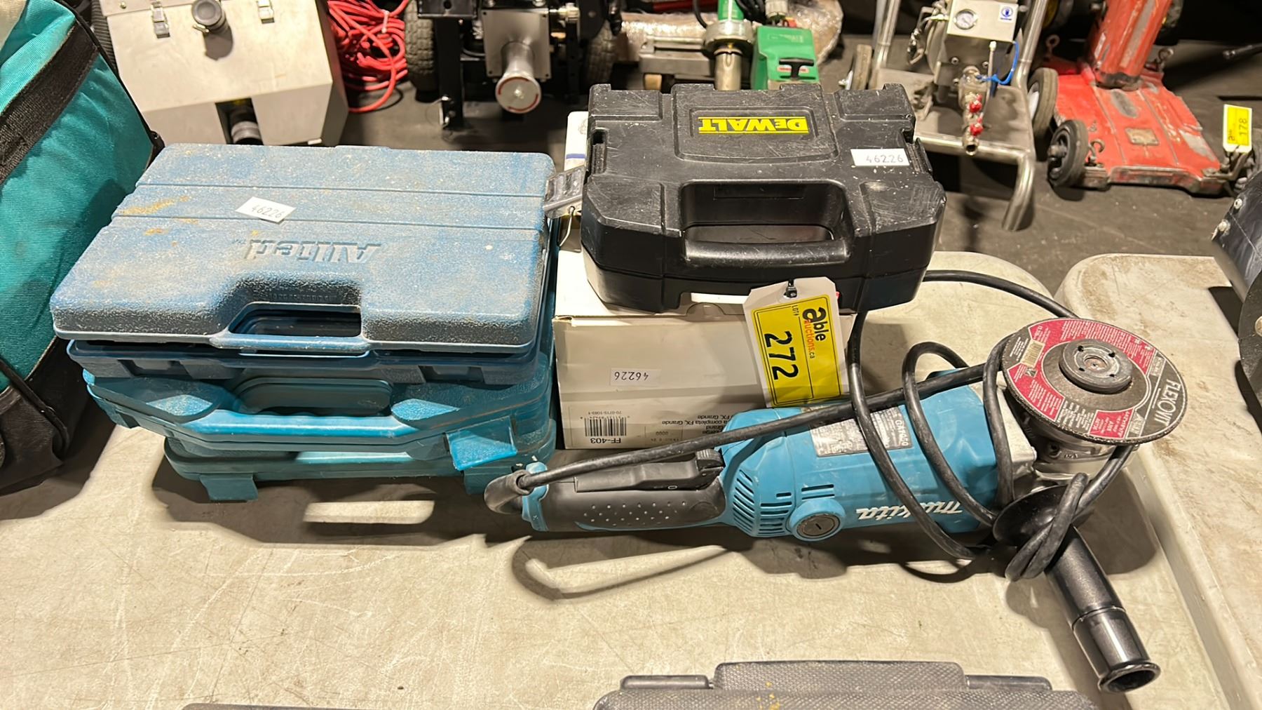MAKITA GA7050 ELECTRIC INDUSTRIAL ANGLE GRINDER, DEWALT HOLE SAWS, RESPIRATOR MASK, MAKITA ASSORTED