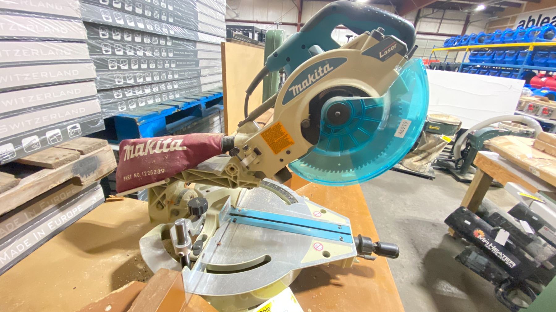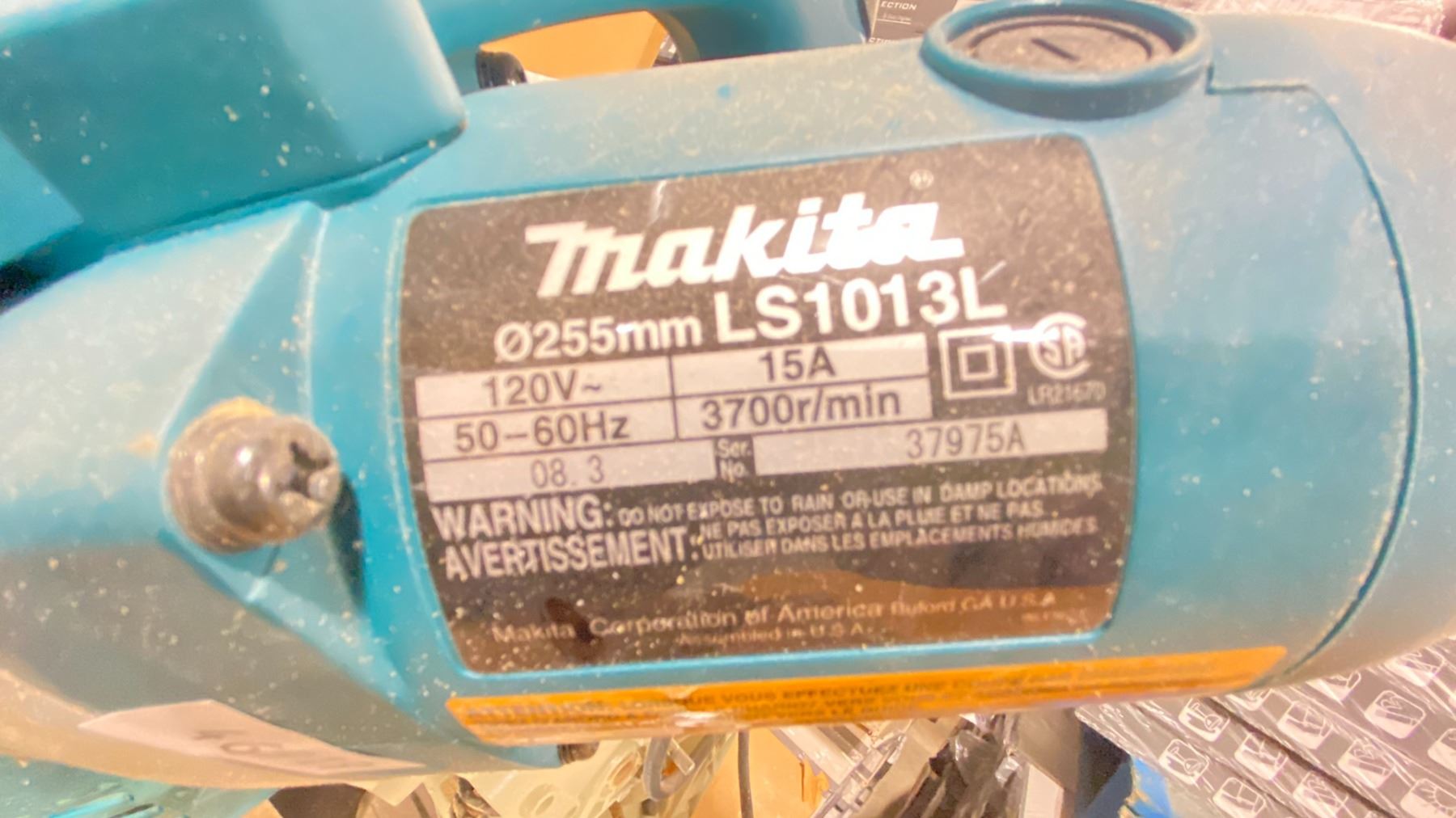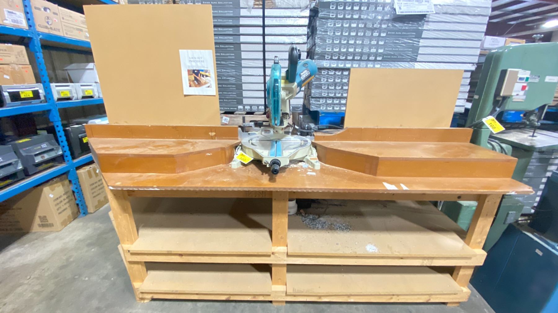 MAKITA LS1013L COMPOUND MITRE SAW WITH APPROX. 9FT X 2.5FT WORK BENCH INCLUDED