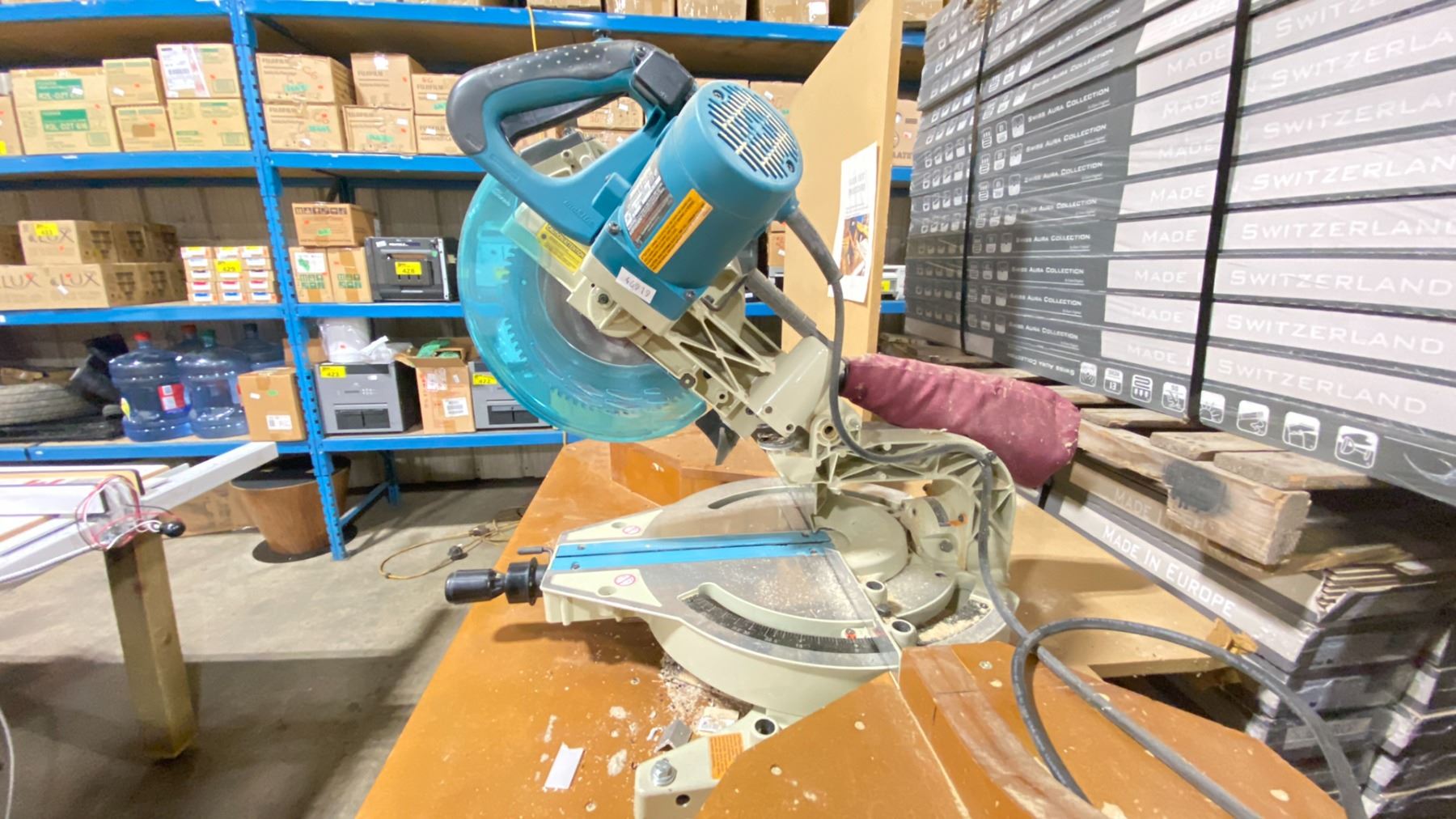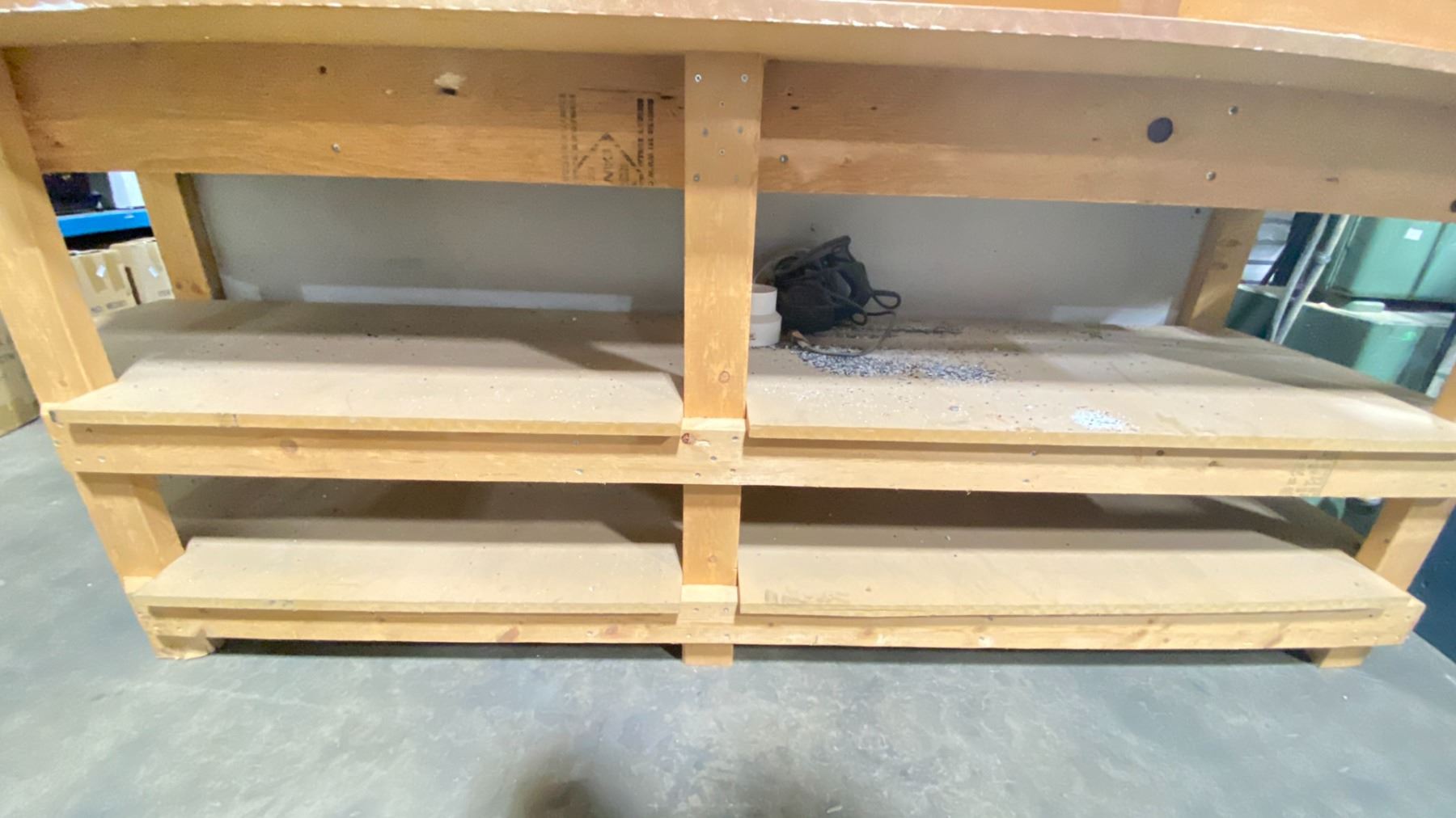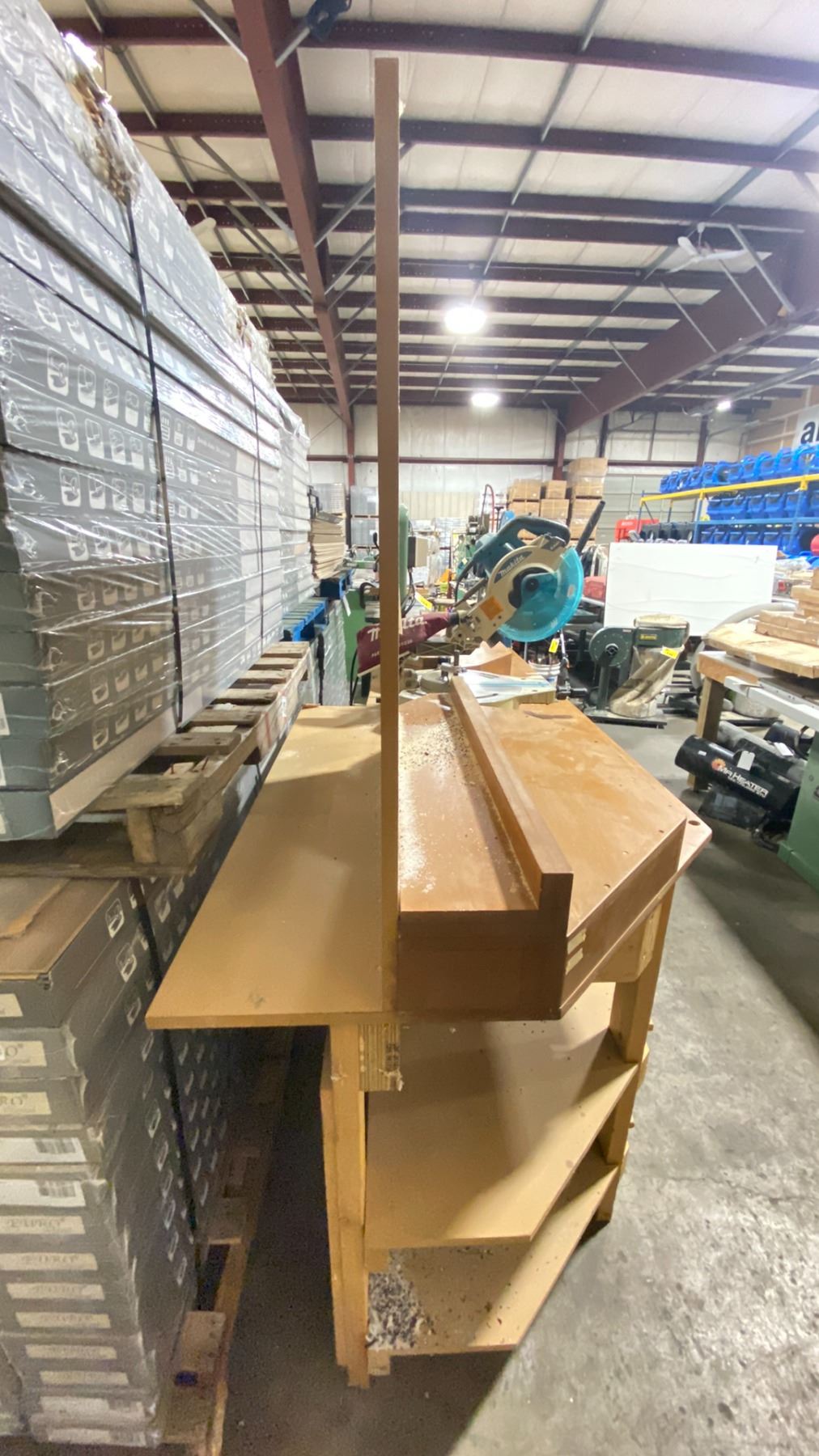 MAKITA LS1013L COMPOUND MITRE SAW WITH APPROX. 9FT X 2.5FT WORK BENCH INCLUDED