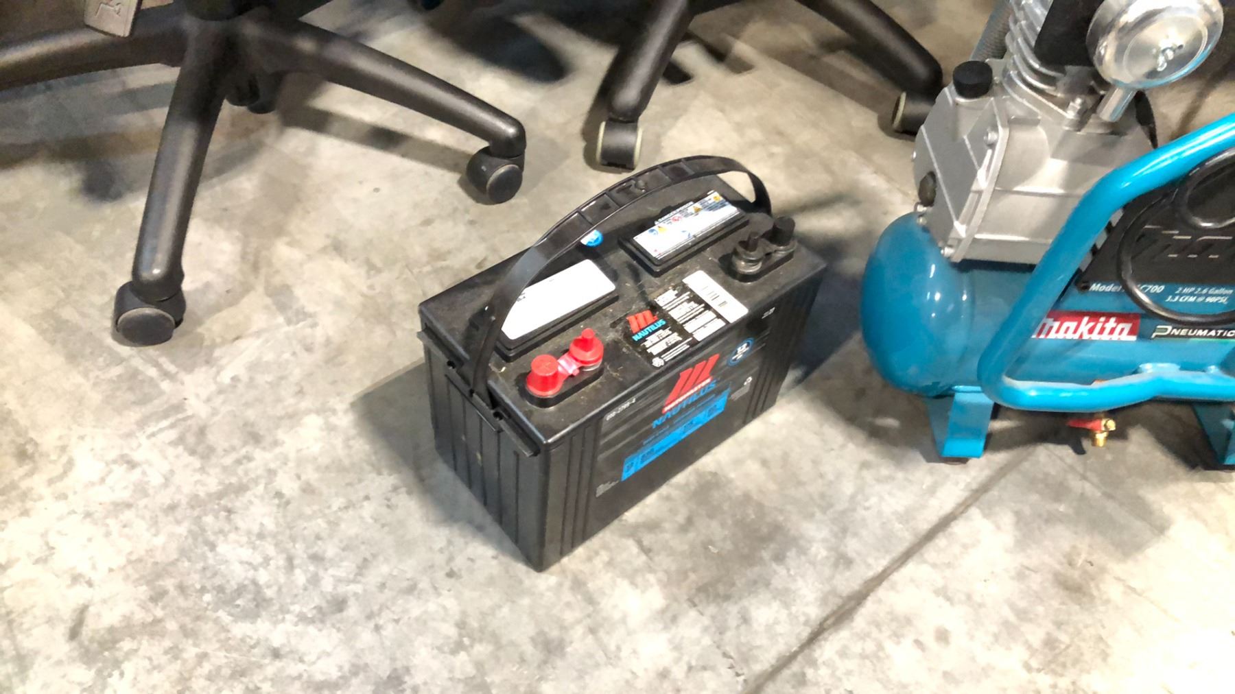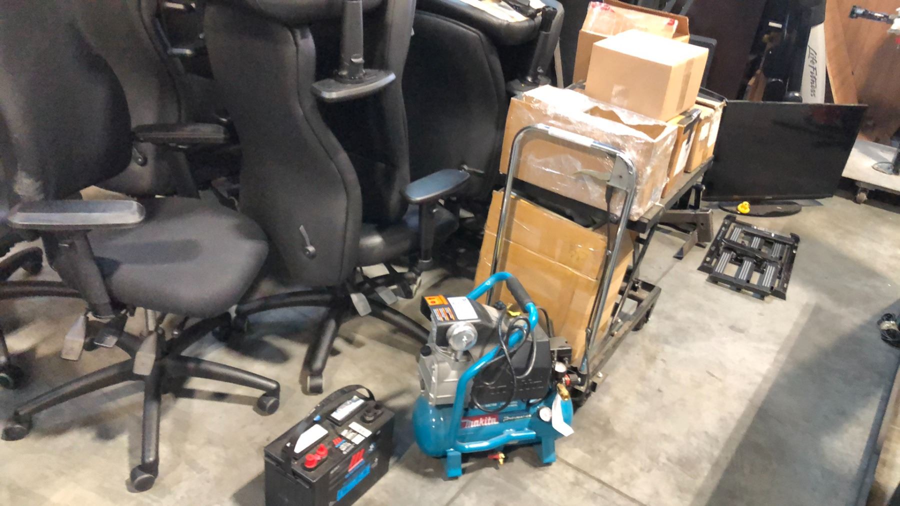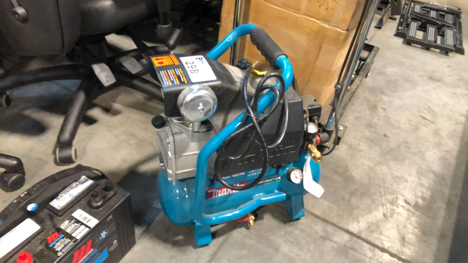 MAKITA MAC700 2.6 GALLON AIR COMPRESSOR AND MOTOMASTER 12V ACID BATTERY 010-2799-4 AND A HYDRAULIC JACK CART WITH CONTENTS