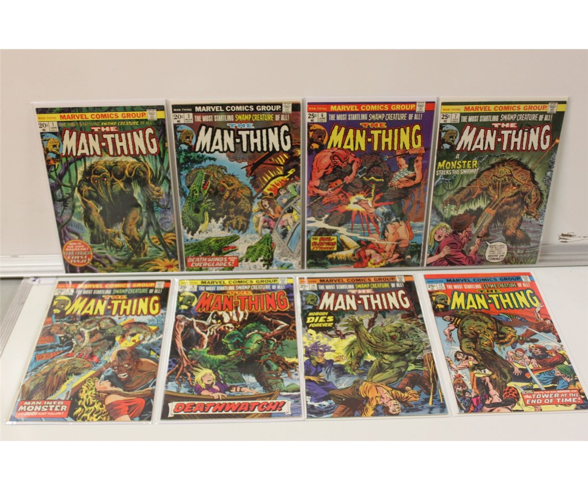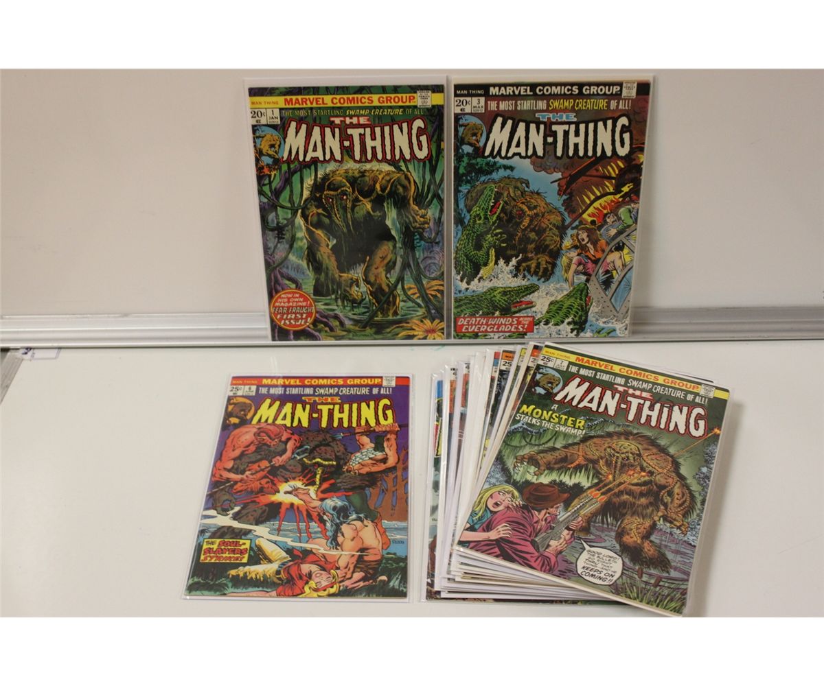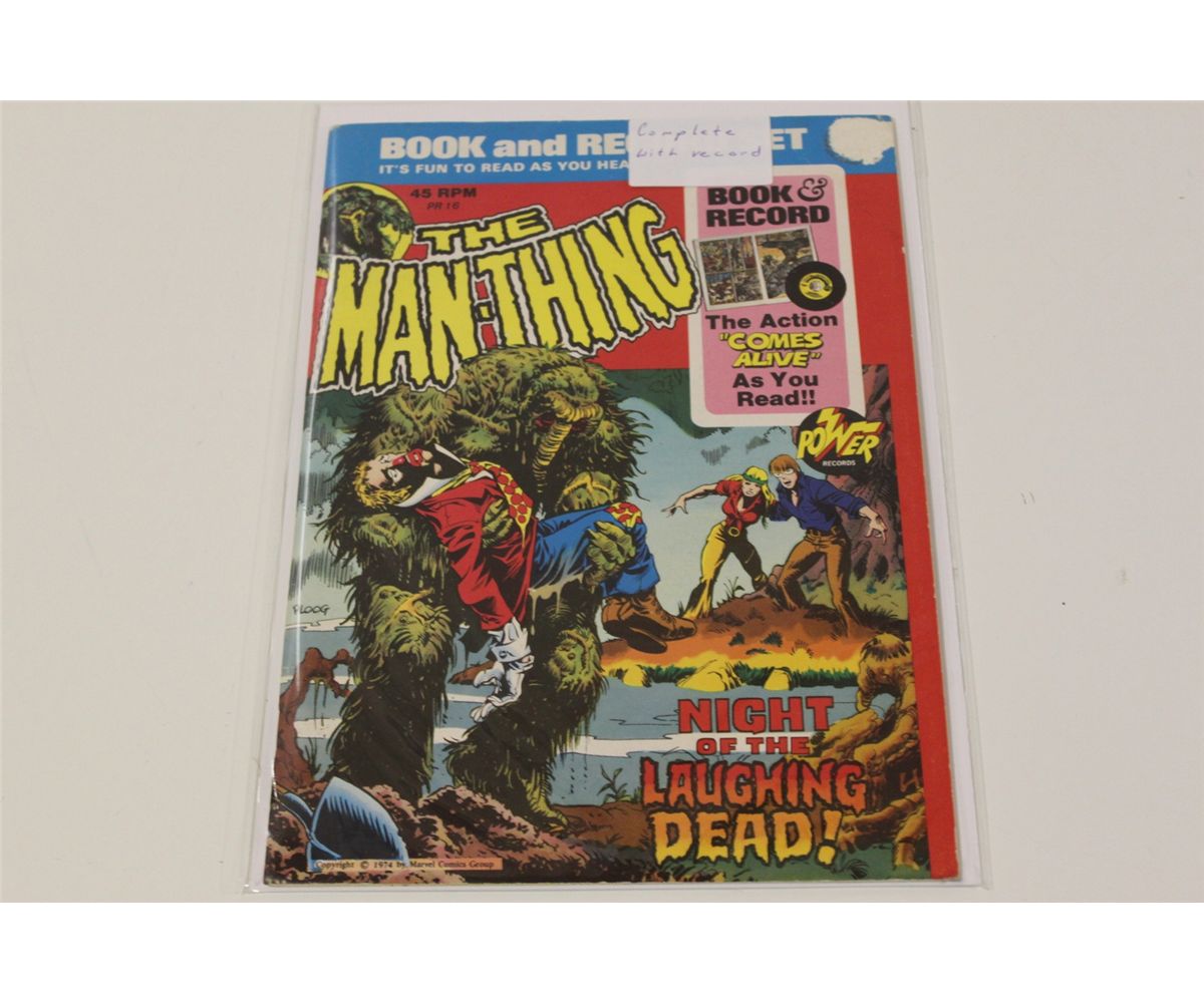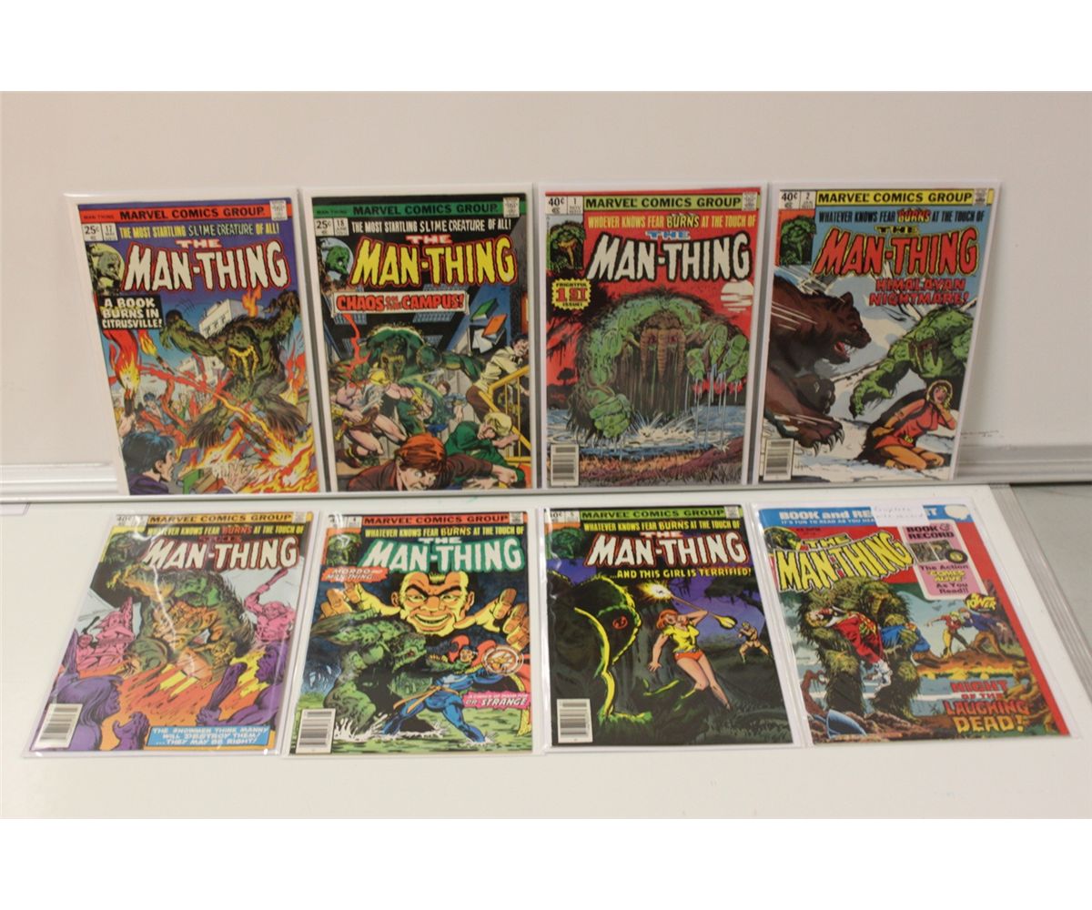 MAN-THING BRONZE AGE LOT (MARVEL) VOL. 1(1974) 10 ISSUES BETWEEN #1-18. VOL. 2 (1979) #1-5 & MAN-THING BOOK & RECORD SET WITH RECORD (1974) MIXED GRADES. VOL. 1, #1 IS A VERY NICE, SHARP, & GLOSSY COPY.