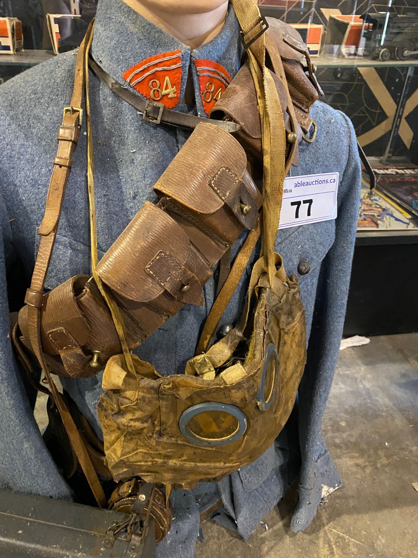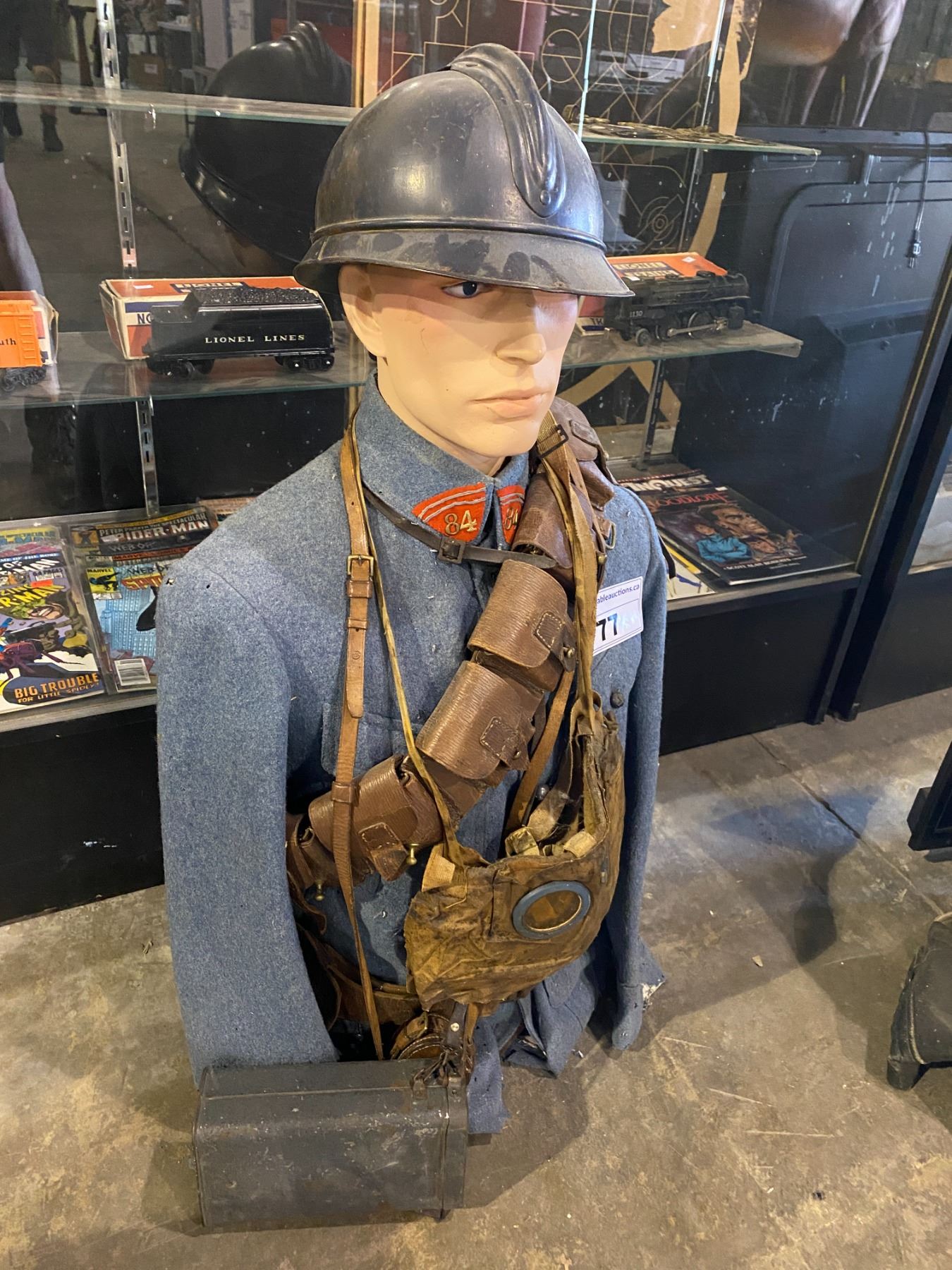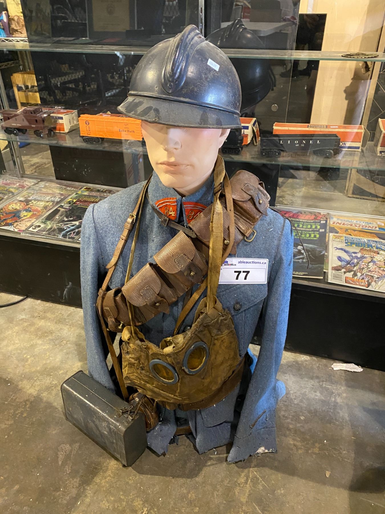 MANNEQUIN WITH VINTAGE WAR CLOTHING & WORLD WAR 1 HELMET