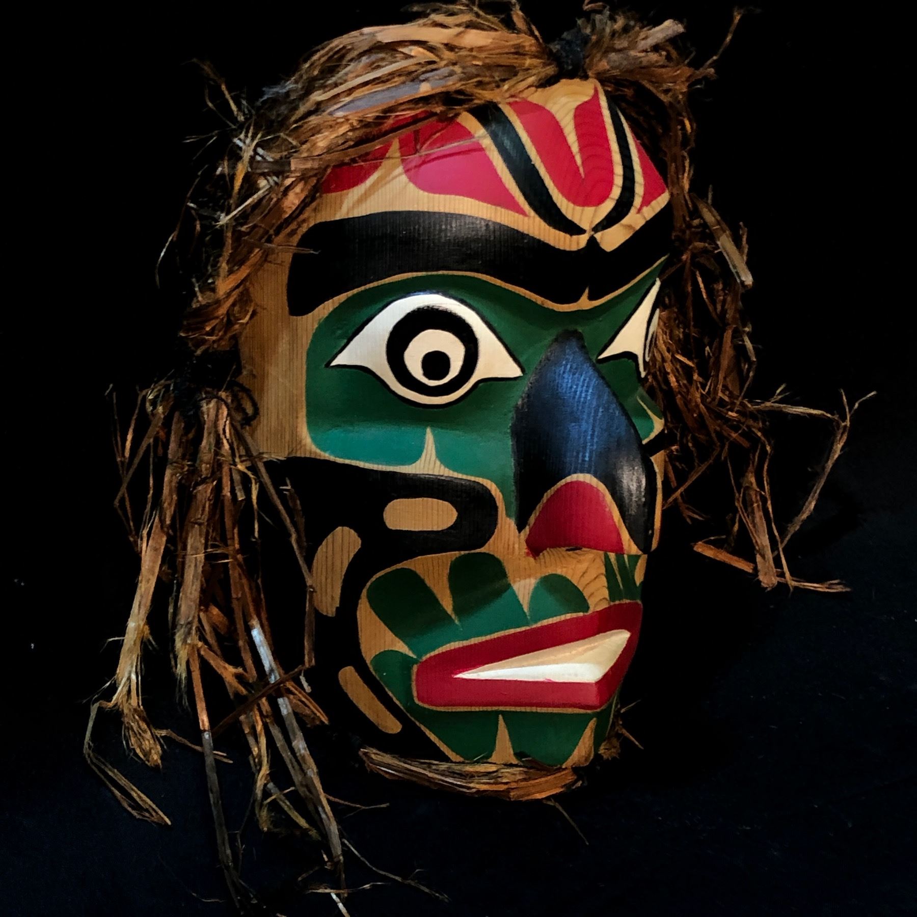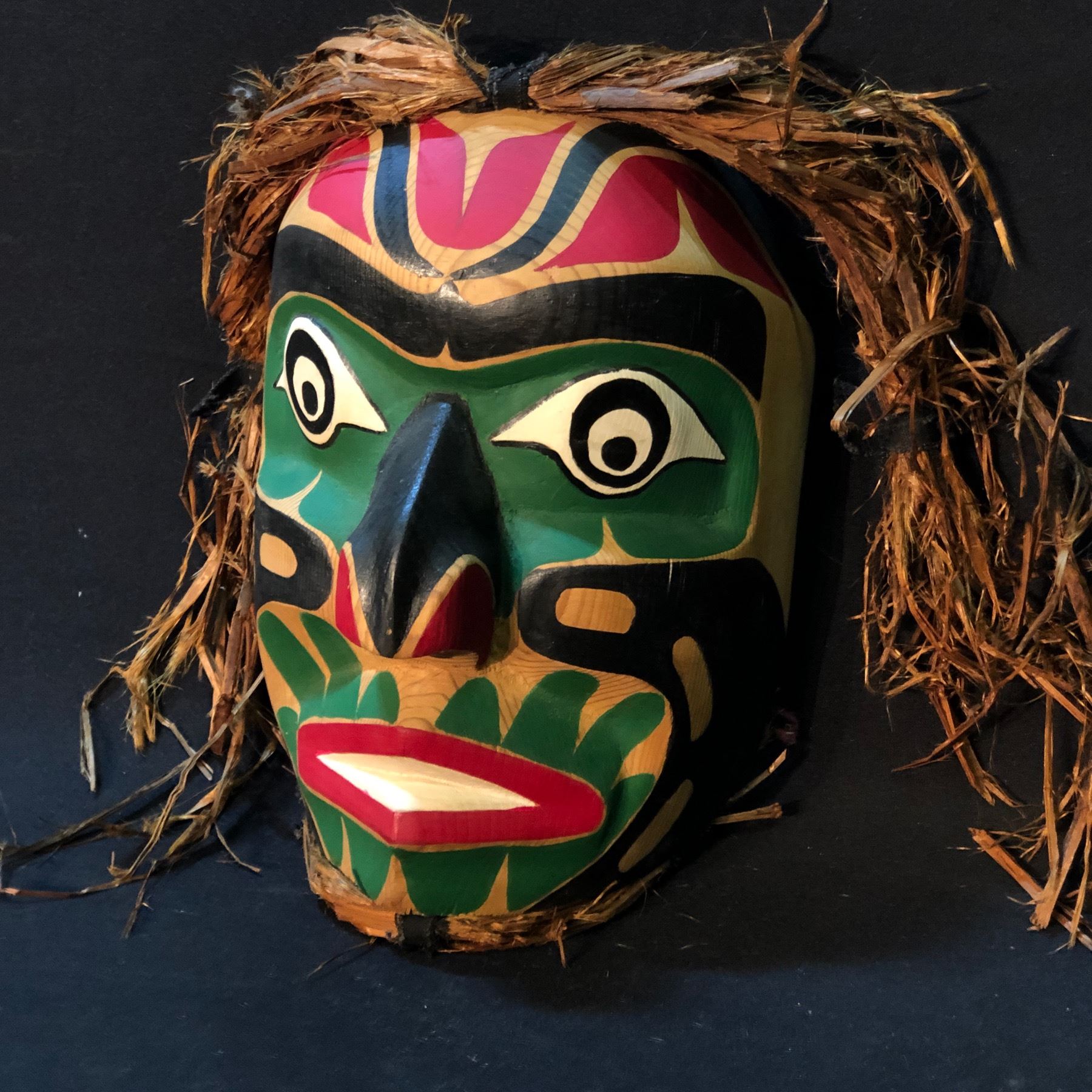 MANNY GEORGESEN HAND CARVED AND PAINTED WILD MAN MASK WITH CEDAR BARK ACCENTS, CARVED IN 1997, SIGNED ON BACK BY ARTIST, 12'' TALL