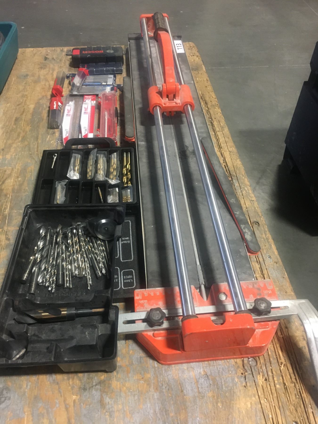 MANUAL TILE CUTTER AND ASSORTED DRILL BITS/RECIPROCATING SAW BLADES/ETC