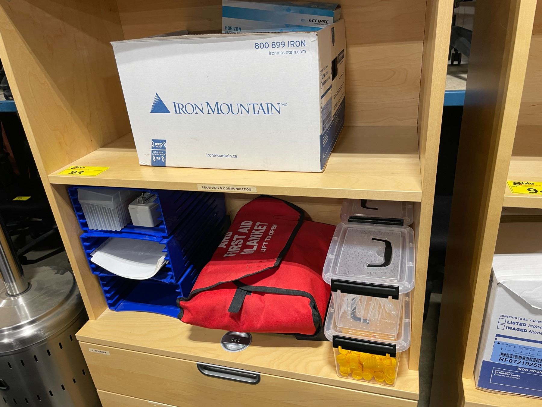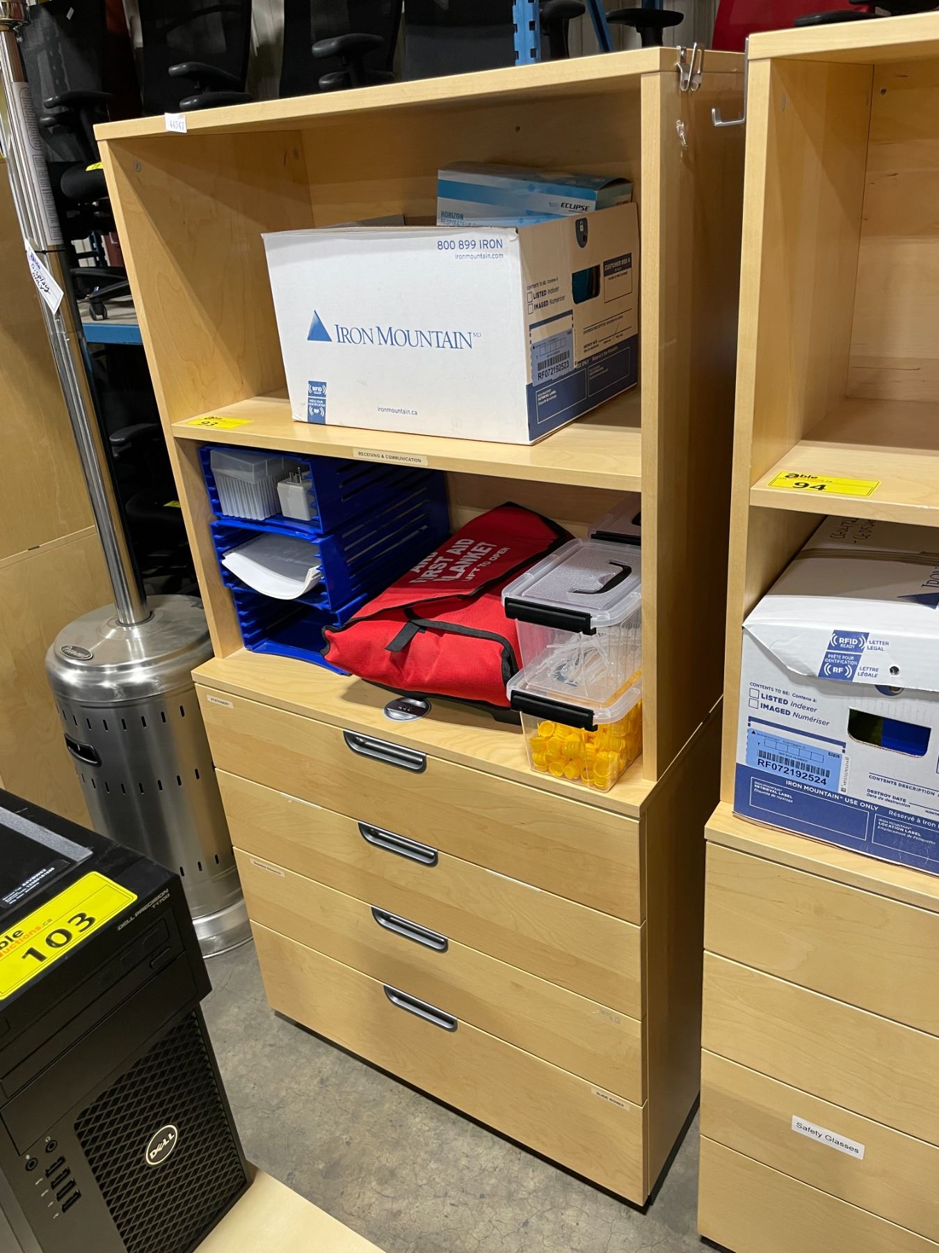 MAPLE 4 DRAWER 32"W X 18"D X 63"H STAGGERED LOCKING COMBINATION STORAGE BOOKCASE WITH LABORATORY CONTENTS *COMBINATION UNKNOWN*