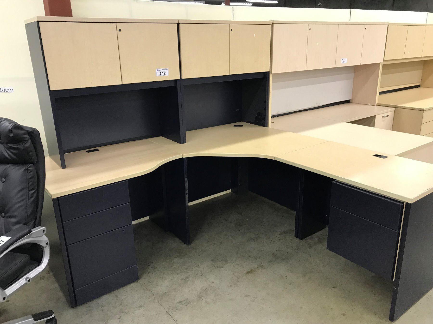 MAPLE AND NAVY BLUE 7' X 7' CORNER COMPUTER DESK WITH HUTCH