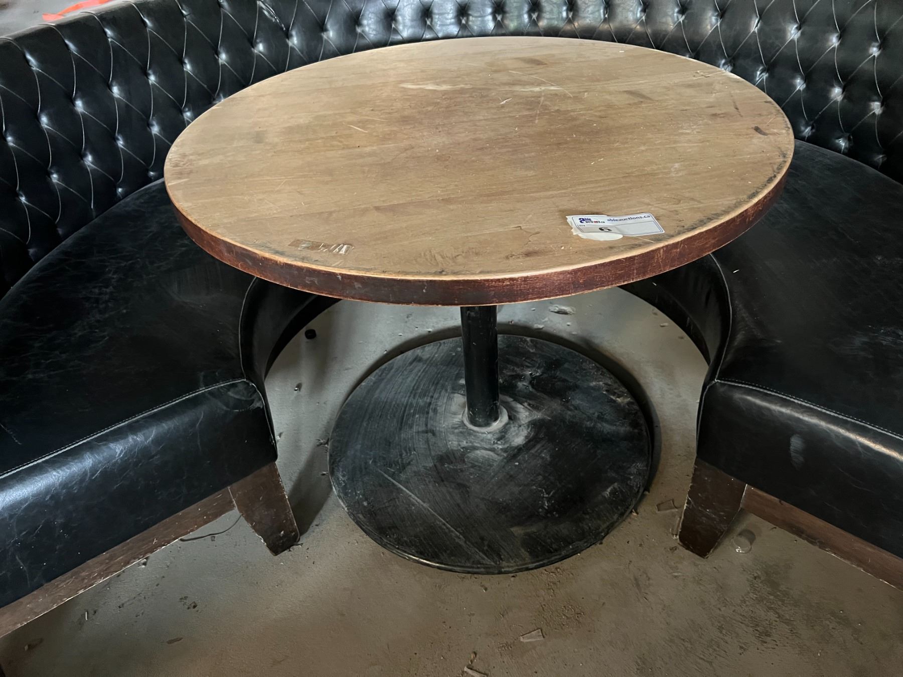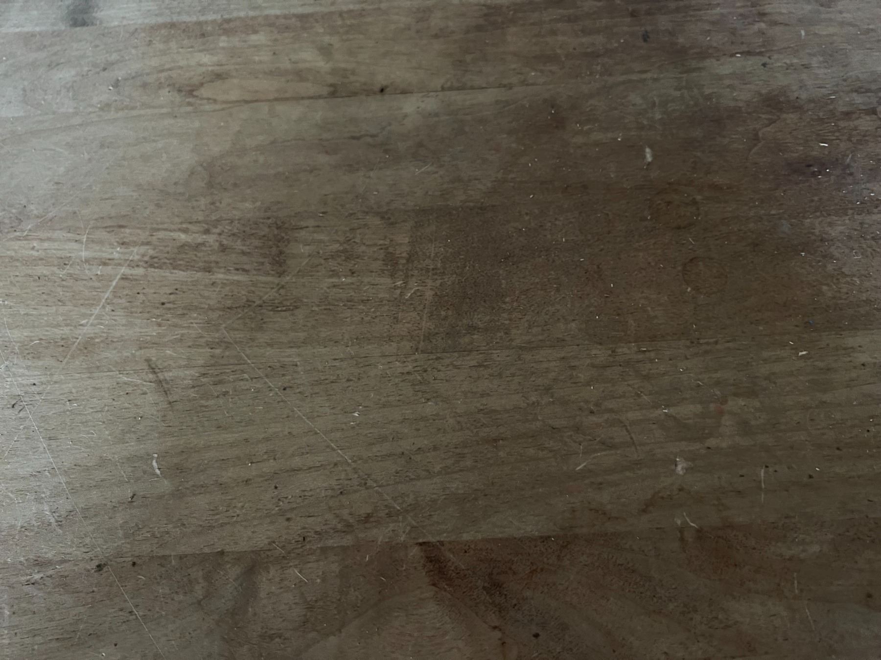 MAPLE BUTCHER BLOCK ROUND TABLE WITH METAL BASE. 39" ROUND. 31" HIGH. NEEDS REFINISHING.