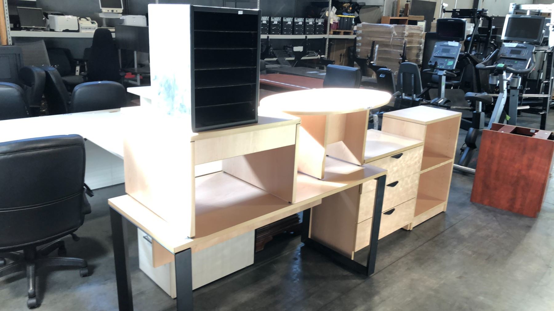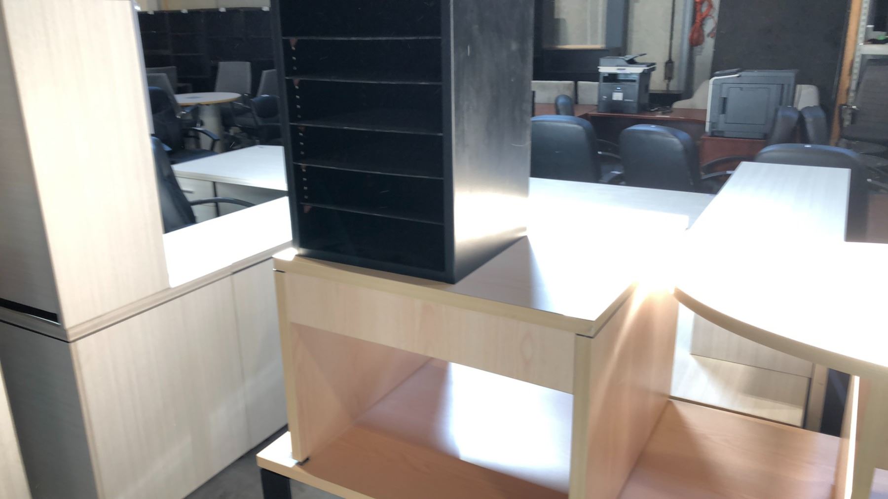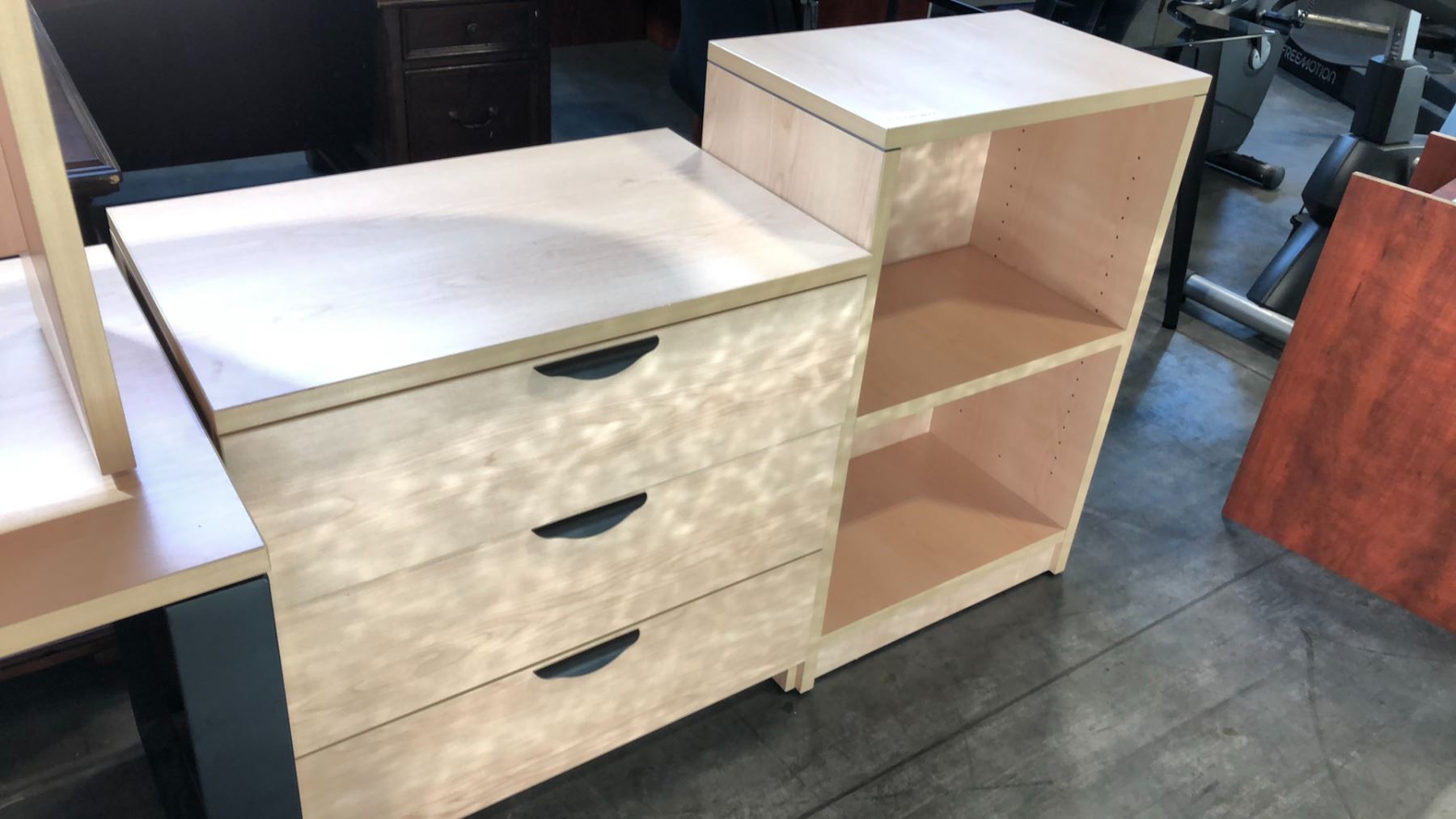 MAPLE COMPUTER DESK, 2 COFFEE TABLE, FILING CABINET, BOOKCASE AND BLACK ORGANIZER