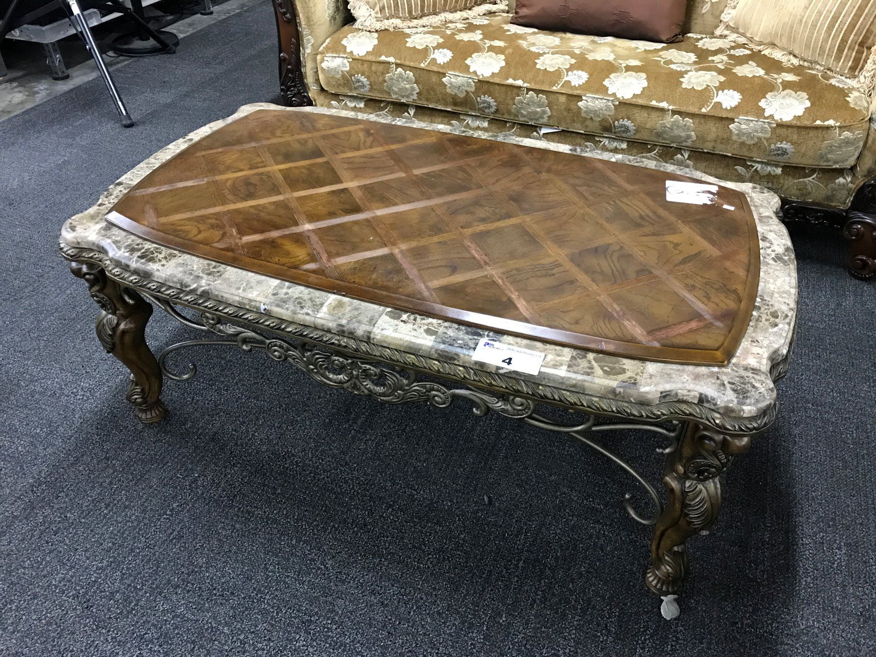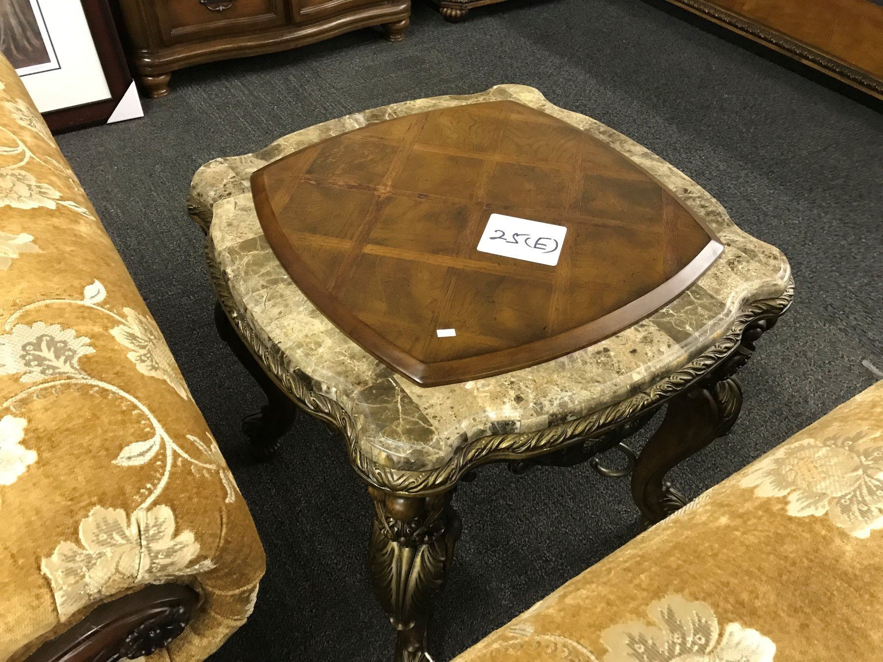 MARBLE AND CHERRY INLAID TRADITIONAL STYLE COFFEE AND END TABLE SET