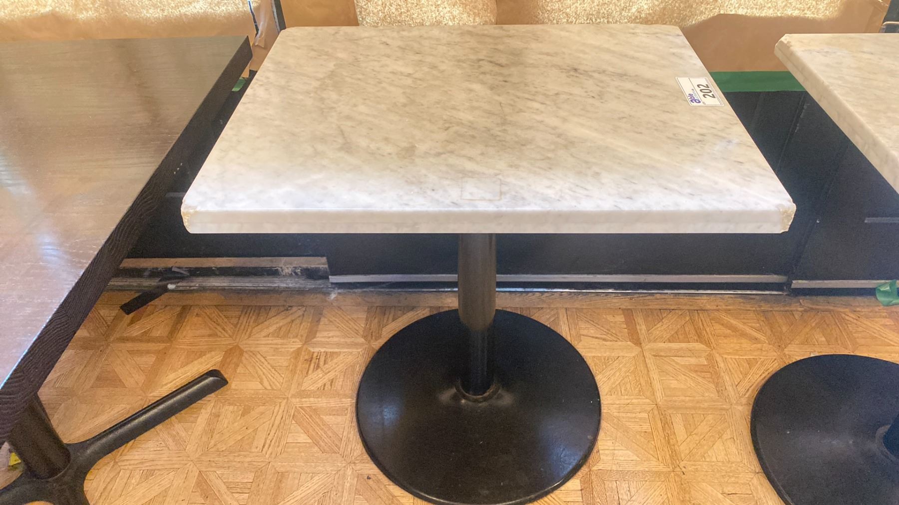 MARBLE TOP 30"W X 24"D X 30"H SINGLE PEDESTAL COMMERCIAL RESTAURANT TABLE *HAS VARIOUS CHIPS ON SIDES & CORNERS*