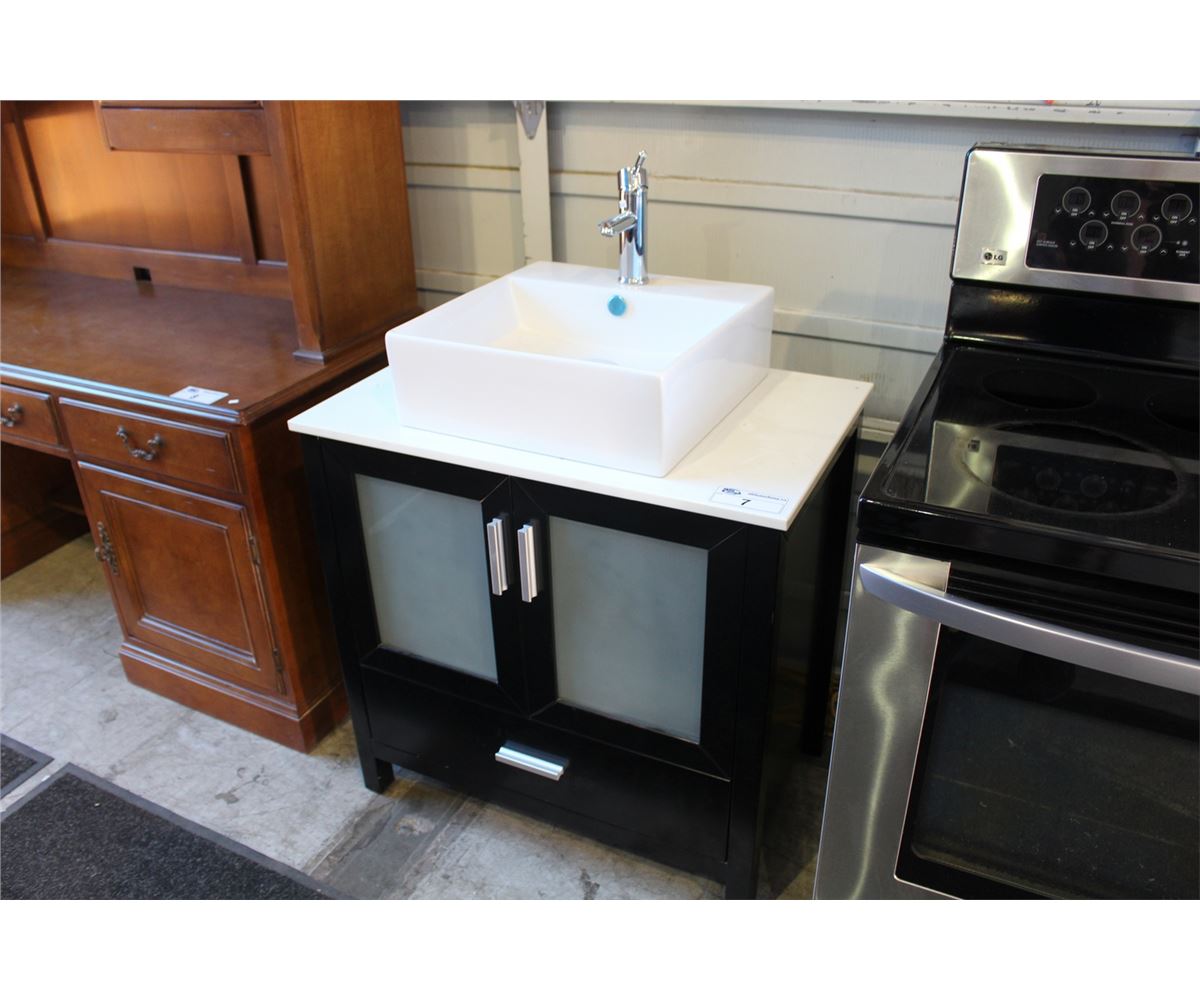 MARBLE TOP BATHROOM CABINET WITH WHITE SINK - MINOR DAMAGE TO MARBLE TOP (DEEP SCRATCH)