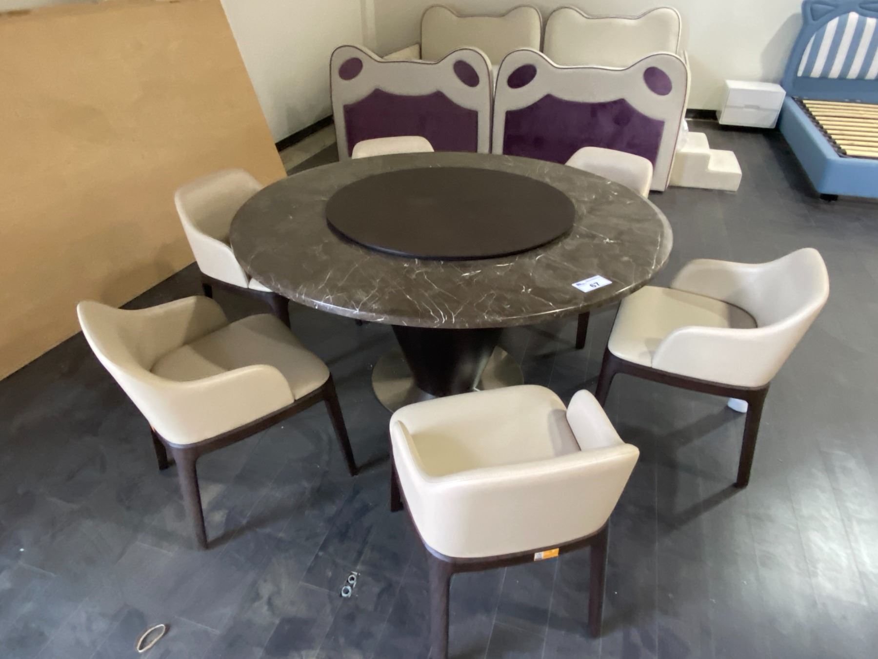 MARBLE TOP DINING ROOM TABLE (60" ACROSS) WITH LAZY SUSAN AND 6 CHAIRS