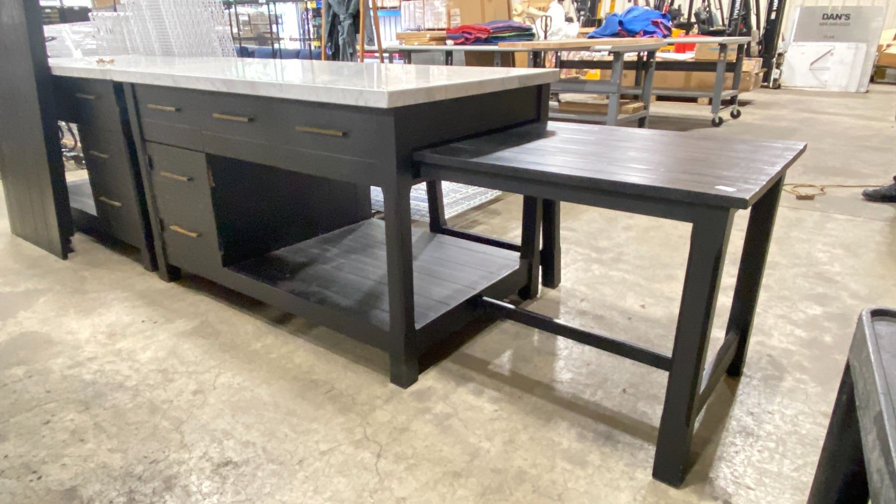 MARBLE TOP KITCHEN ISLAND WITH ROLL OUT SIDE TABLE, DUAL SIDED DRAWERS & CUPBOARDS APPROX 60"W X 36"D X 36.25"H ( NOT EXTENDED ) * 1 CUPBOARD DOOR NEEDS REPAIR *