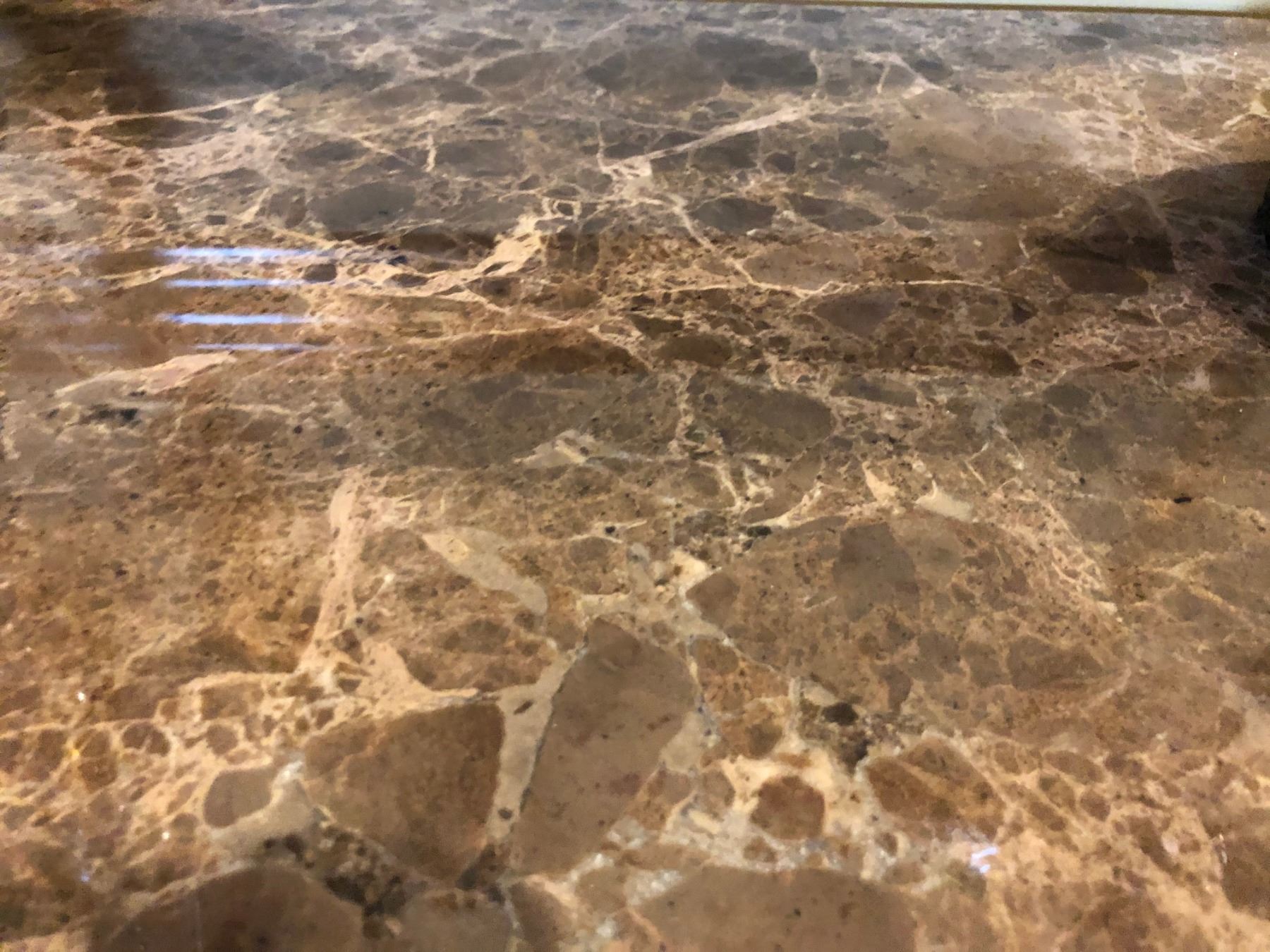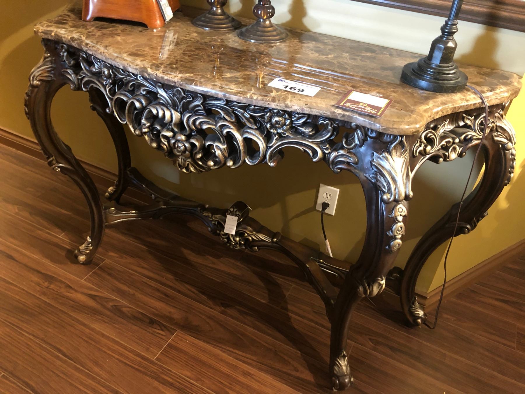 MARBLE TOP WITH CARVED WOODEN BASE HALL TABLE. RETAIL $3,300.00