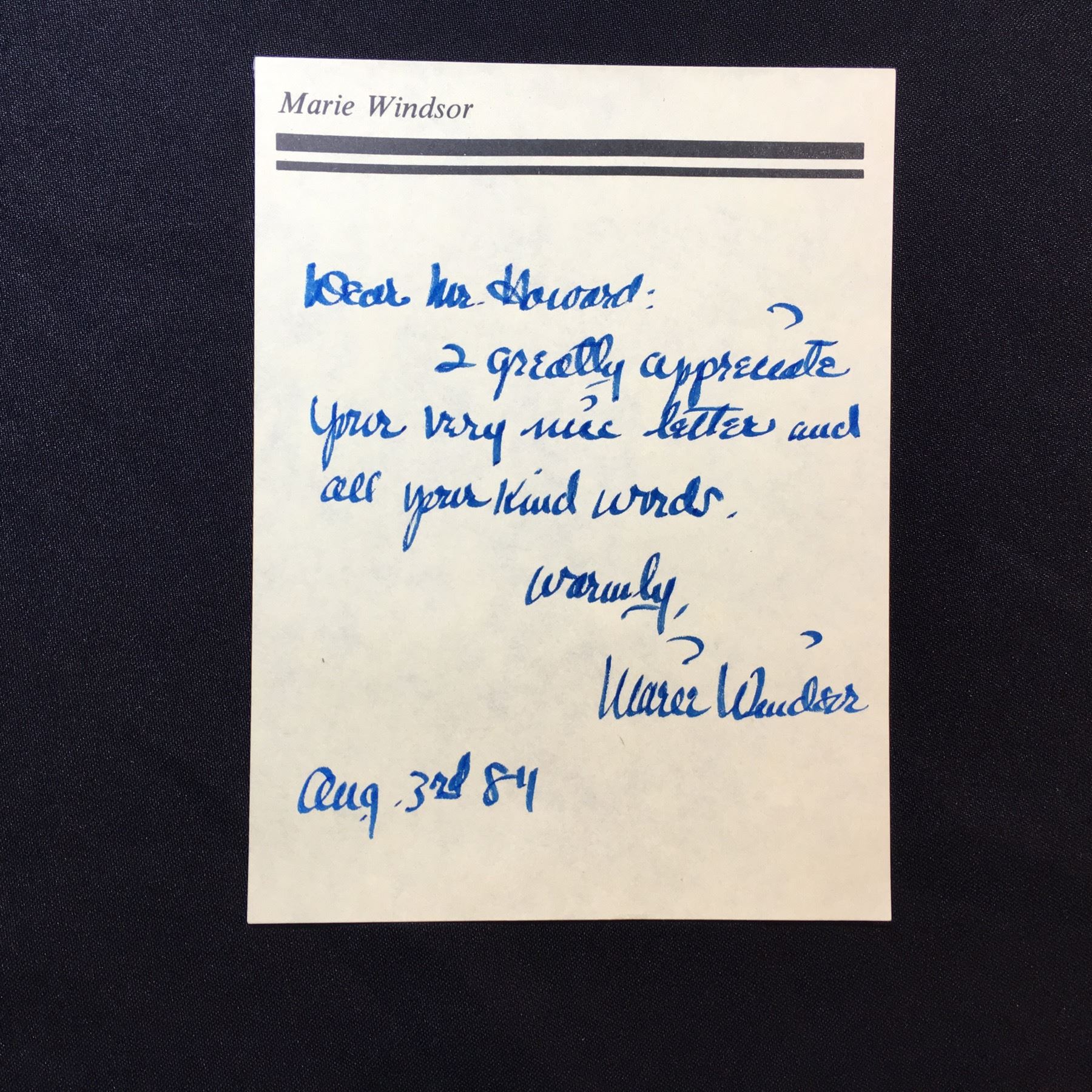 MARIE WINDSOR HAND WRITTEN AND SIGNED NOTE, ON HER OFFICIAL PERSONAL 5.5'' X 7.5'' LETTERHEAD, DATED AUGUST 3, 1984