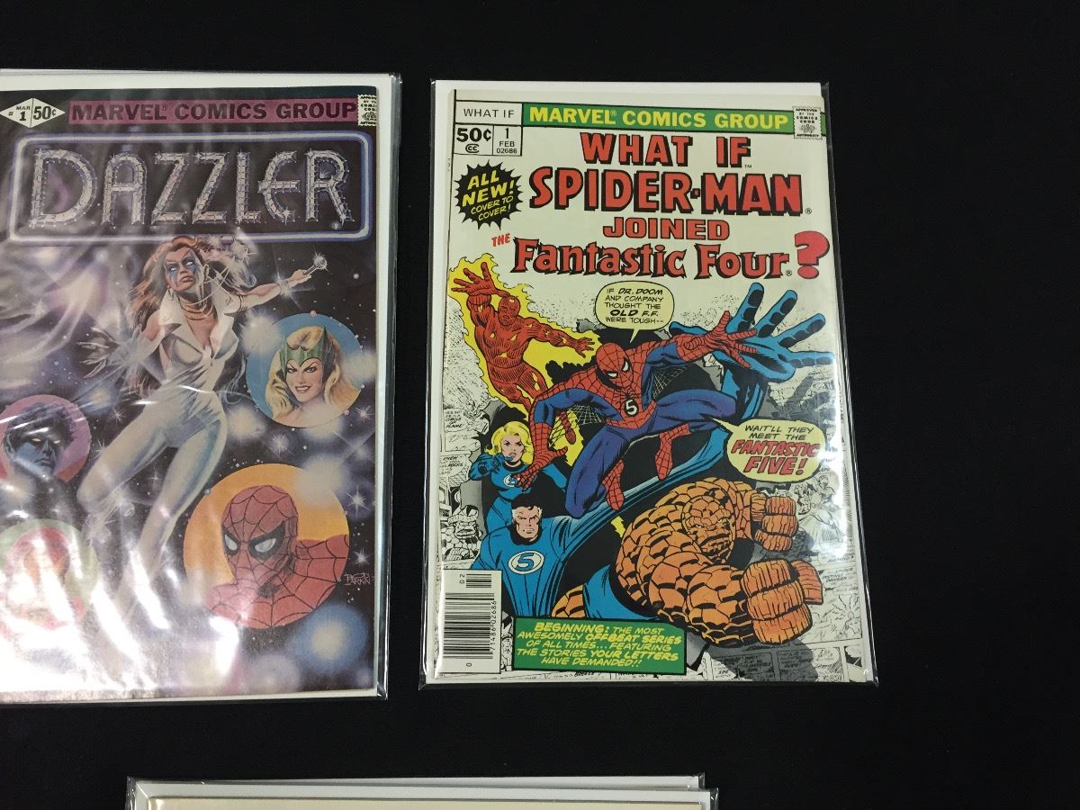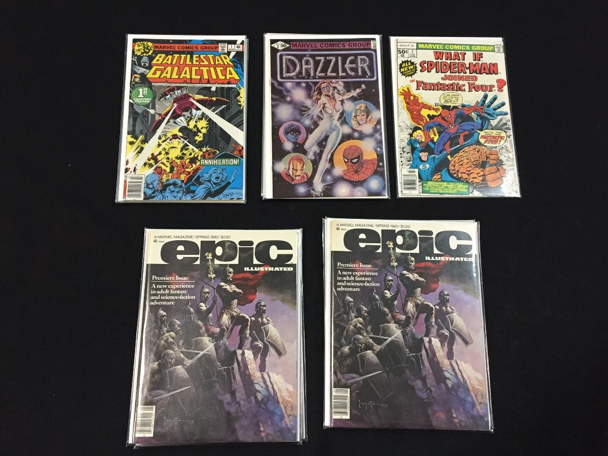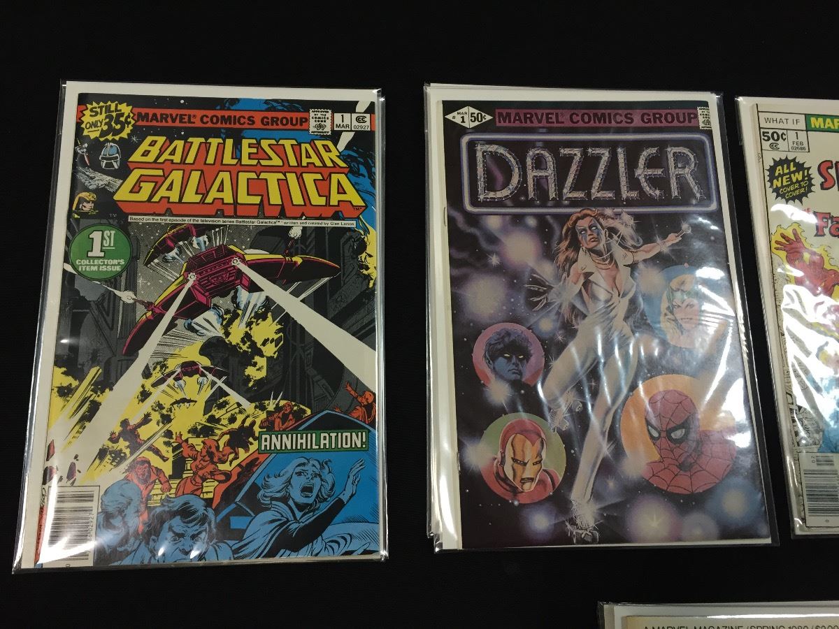 MARVEL & DC BRONZE #1'S LOT (1970'S-80'S) INCLUDES BATTLESTAR GALACTICA #1 (X2), DAZZLER #1 (X4), NEW TEEN TITANS #1, STAR WARS (REPRINT) #1, WHAT IF? #1 & EPIC #1 (X4). HIGH MID TO HIGH GRADE AVG. 13 BOOKS TOTAL,