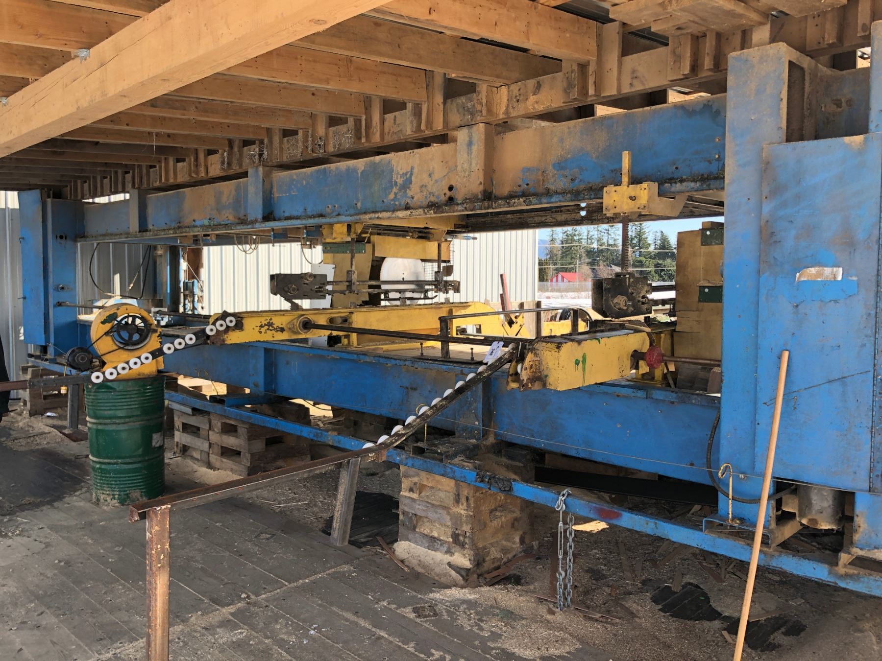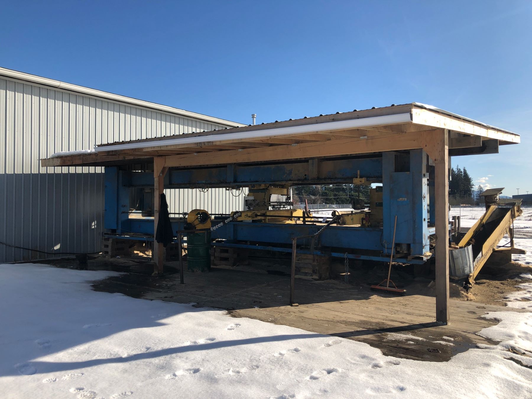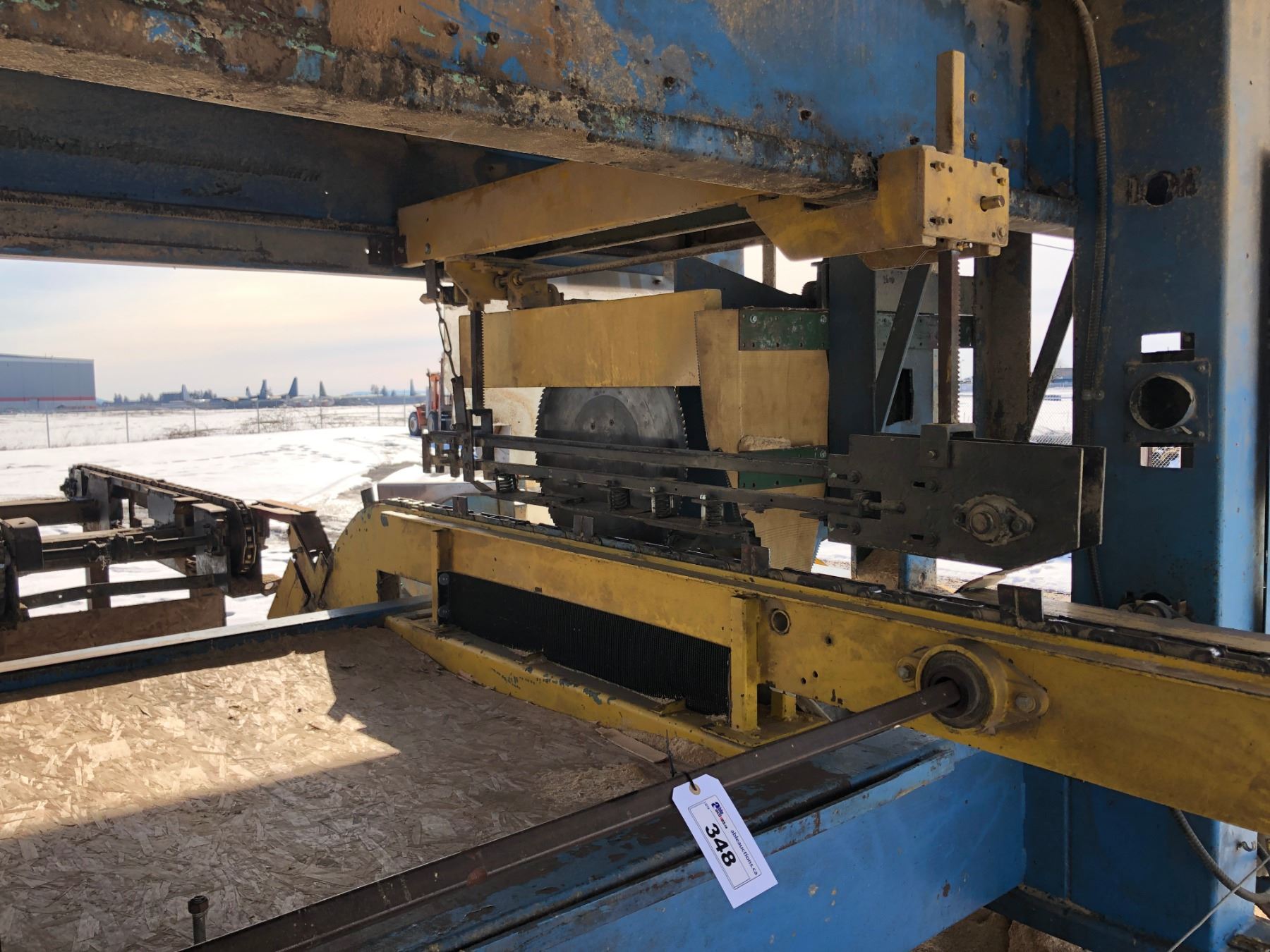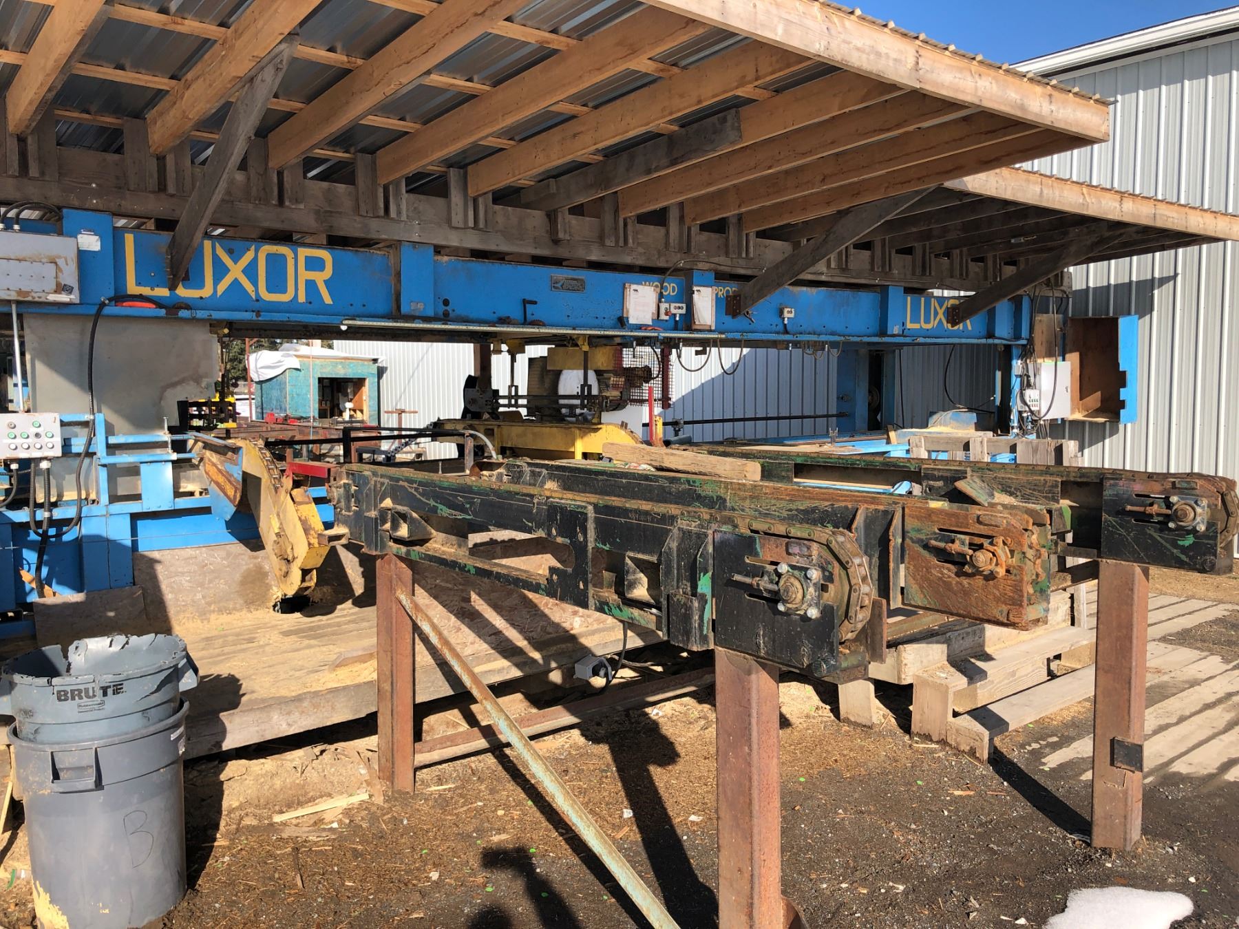 MASSIVE TIMBER MILL COMPONENT LUXOR P.E.T. BLUE DUAL SAW SYSTEM INCLUDING: ROLLER CONVEYORS, DUST/SCRAP CONVEYOR EJECTION SYSTEM, MOTORIZED CONVEYOR STANDS & MORE