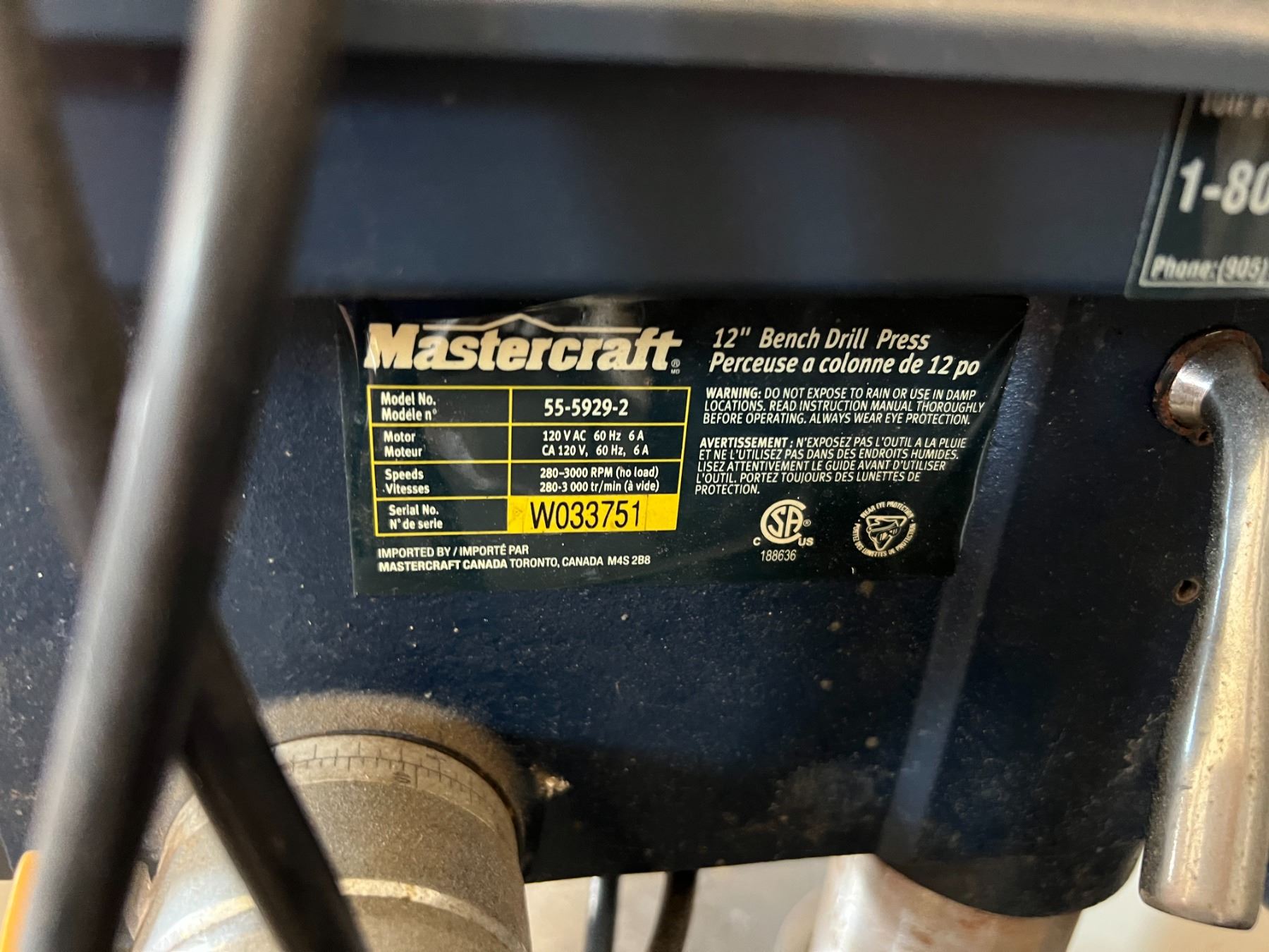 MASTERCRAFT 12" BENCH DRILL PRESS MODEL 55-5929-2