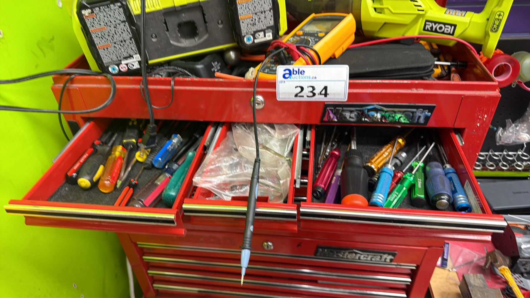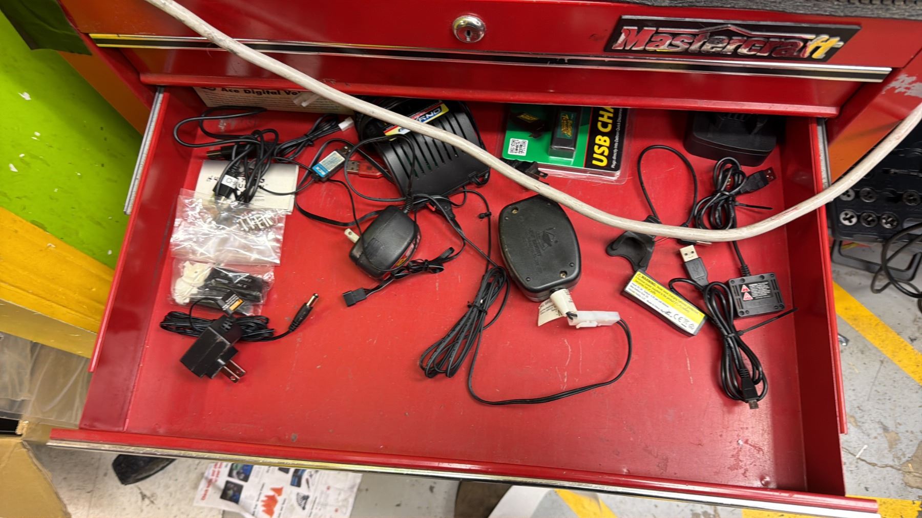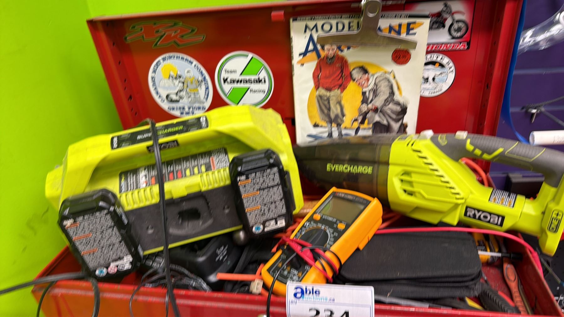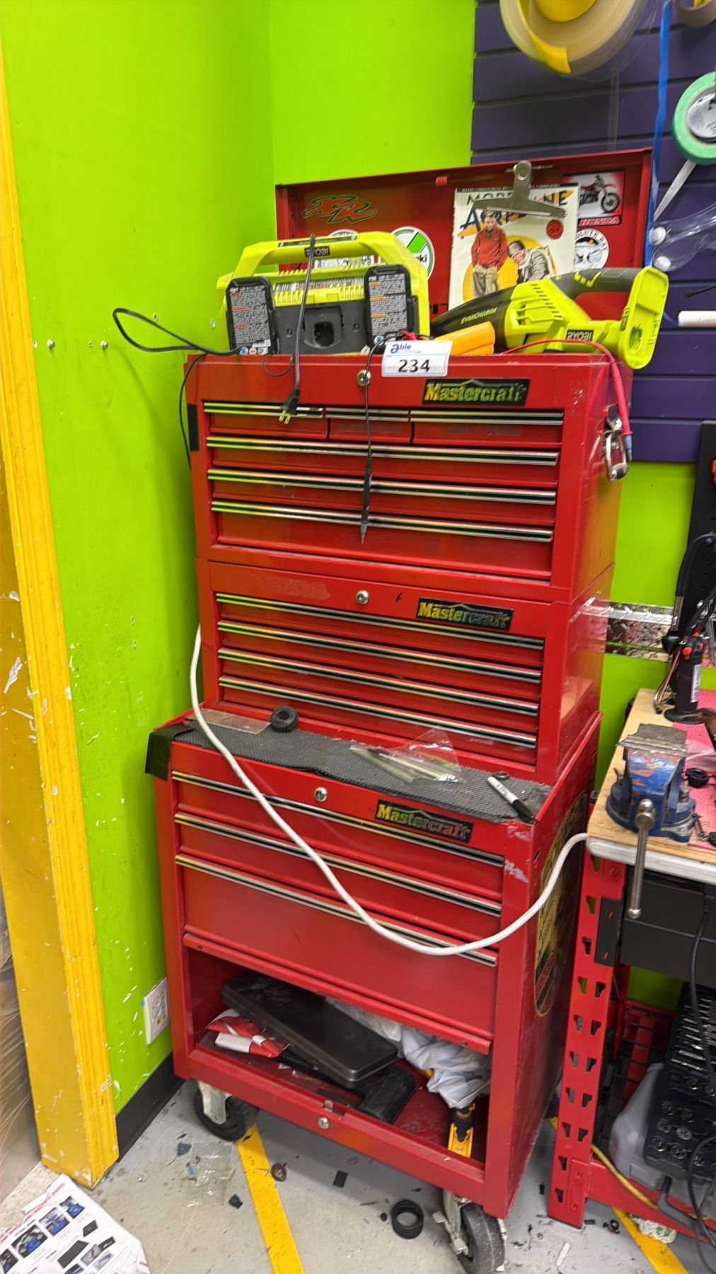 MASTERCRAFT 3-PC PORTABLE TOOLBOX WITH CONTENTS INCLUDING; RYOBI AIR COMPRESSOR, VACUUM & CHARGER