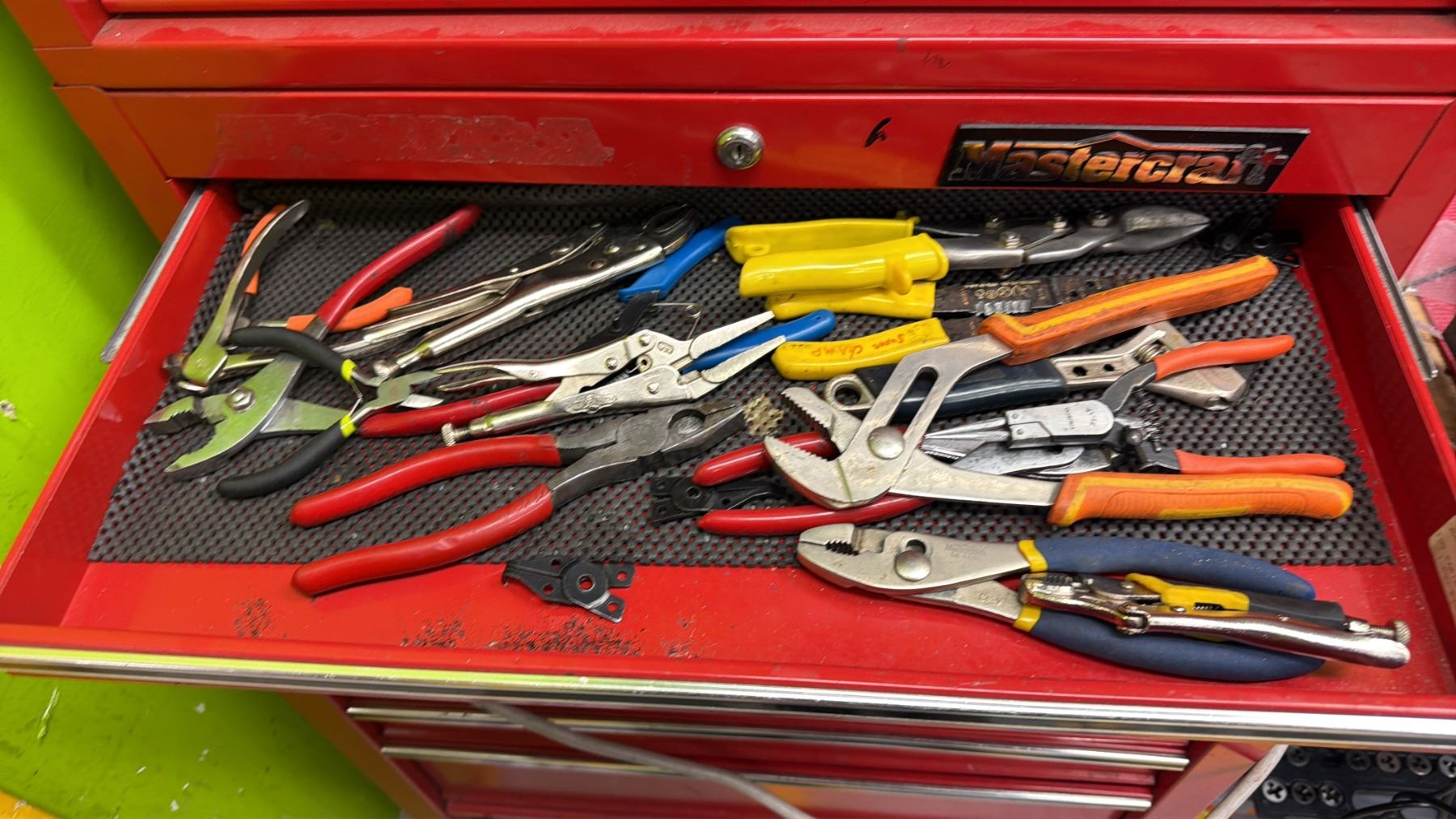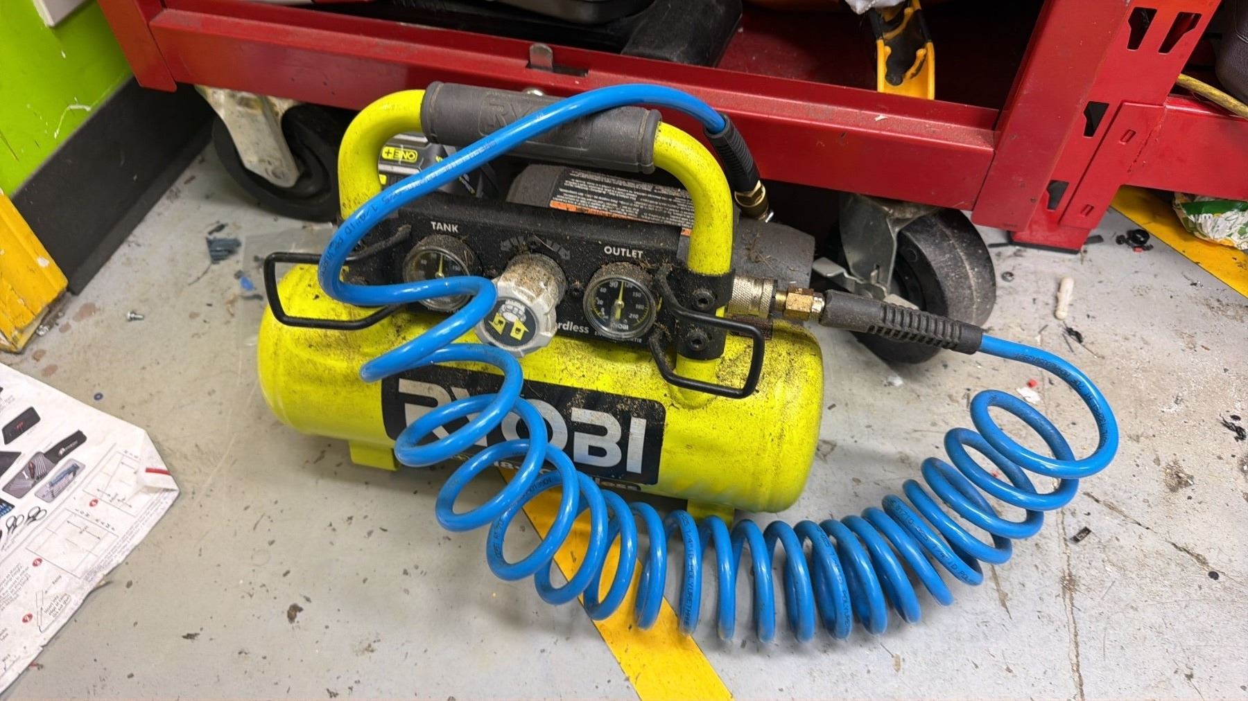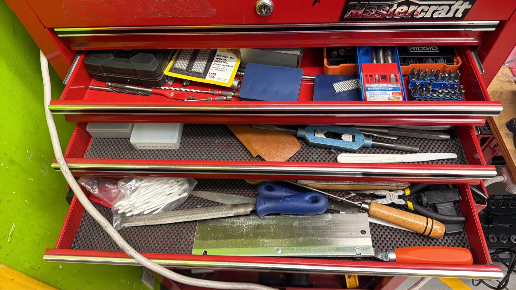 MASTERCRAFT 3-PC PORTABLE TOOLBOX WITH CONTENTS INCLUDING; RYOBI AIR COMPRESSOR, VACUUM & CHARGER