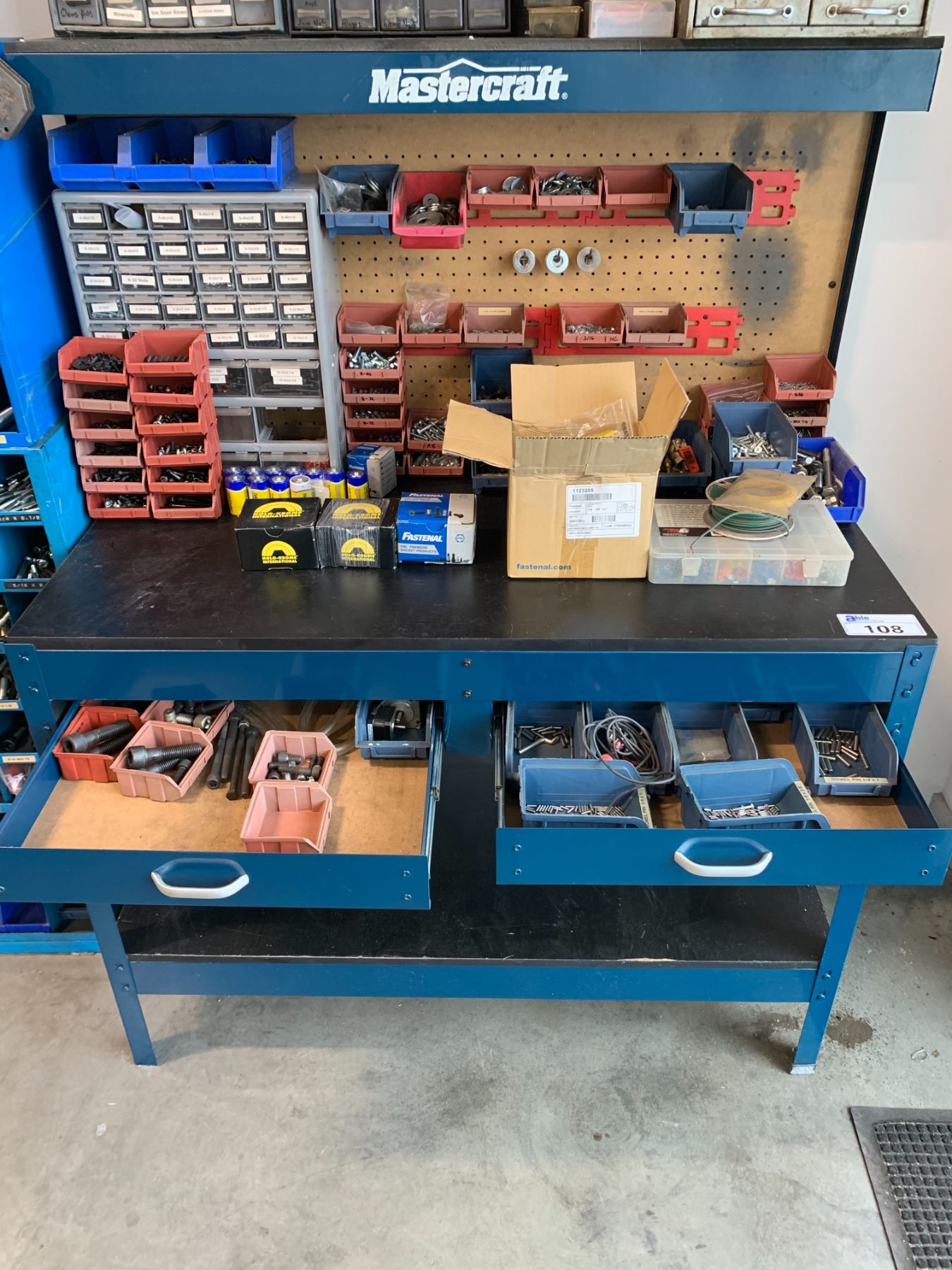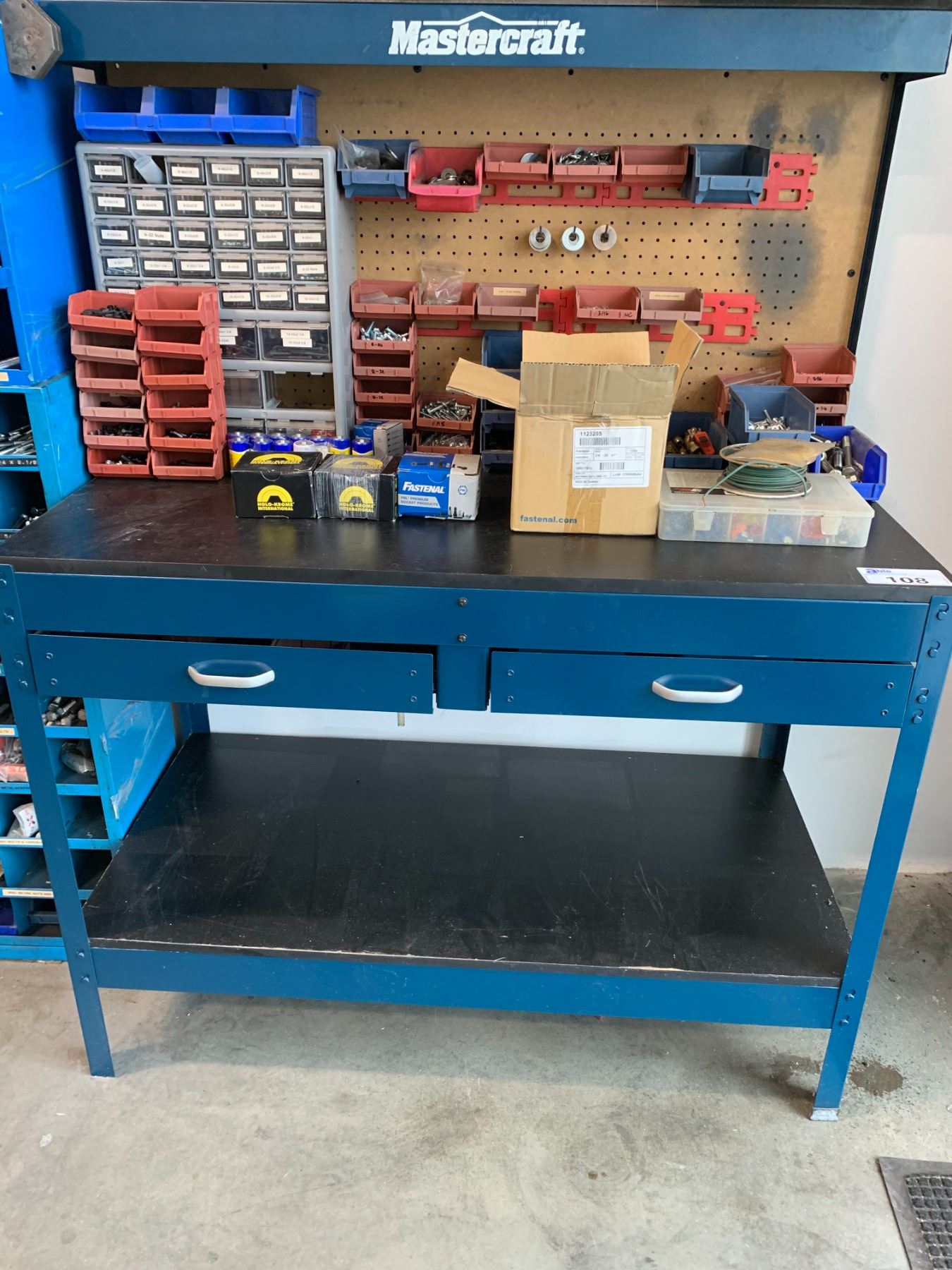 MASTERCRAFT BLUE & BLACK 2 DRAWER WORK TABLE WITH PEGBOARD BACK-APPROX 4FT X 2FT X 5FT HIGH