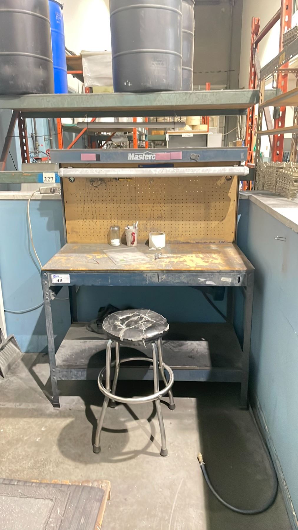 MASTERCRAFT BLUE METAL 48"W X 24"D X 36"H INDUSTRIAL WORKBENCH WITH PEGBOARD BACK SHELF WITH STOOL AND 2 ADJUSTABLE PART SHELFS