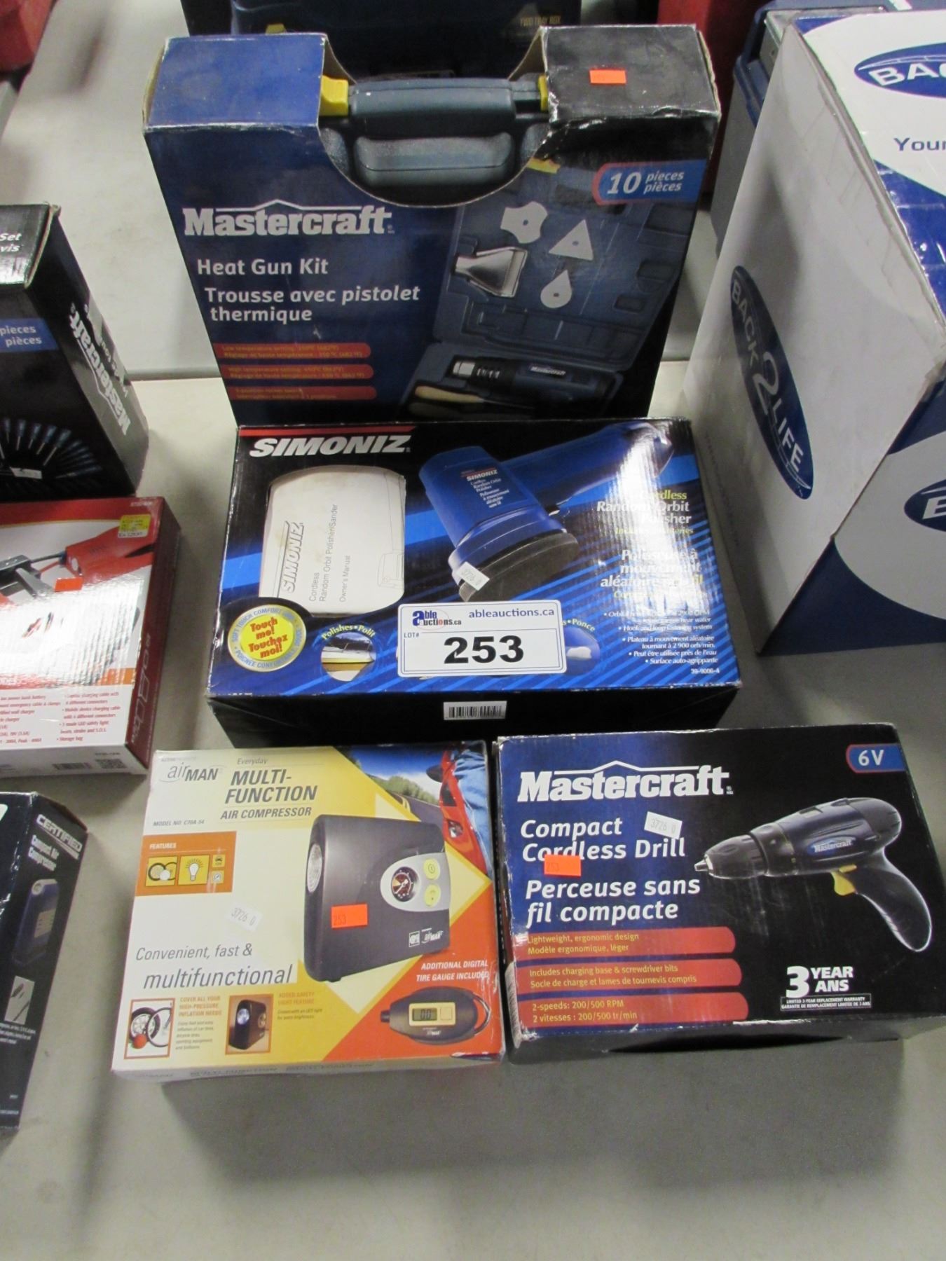MASTERCRAFT HEAT GUN, MASTERCRAFT COMPACT CORDLESS DRILL, MULTI-FUNCTION AIR COMPRESSOR, SIMONIZ CORDLESS RANDOM ORBIT POLISHER