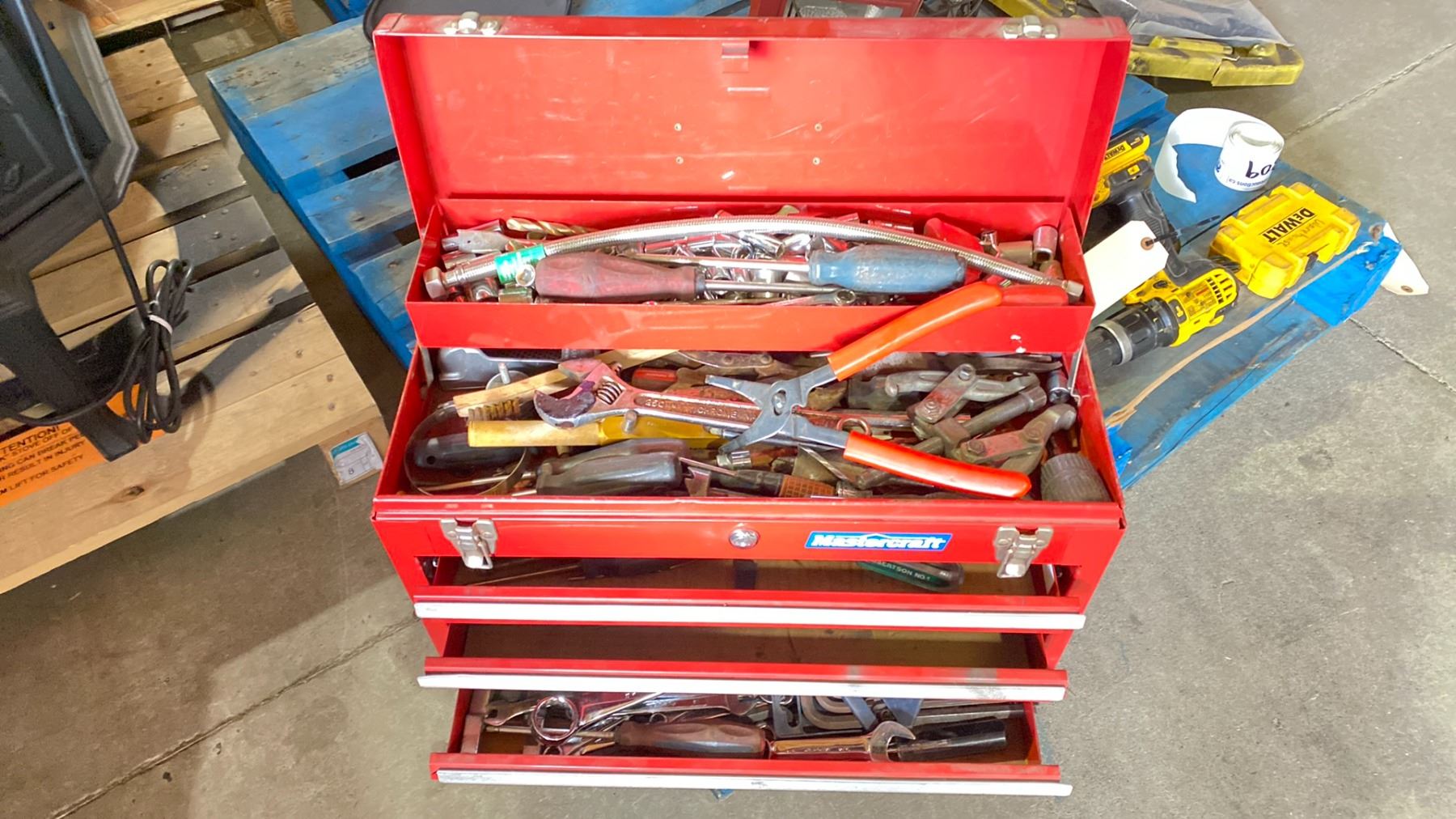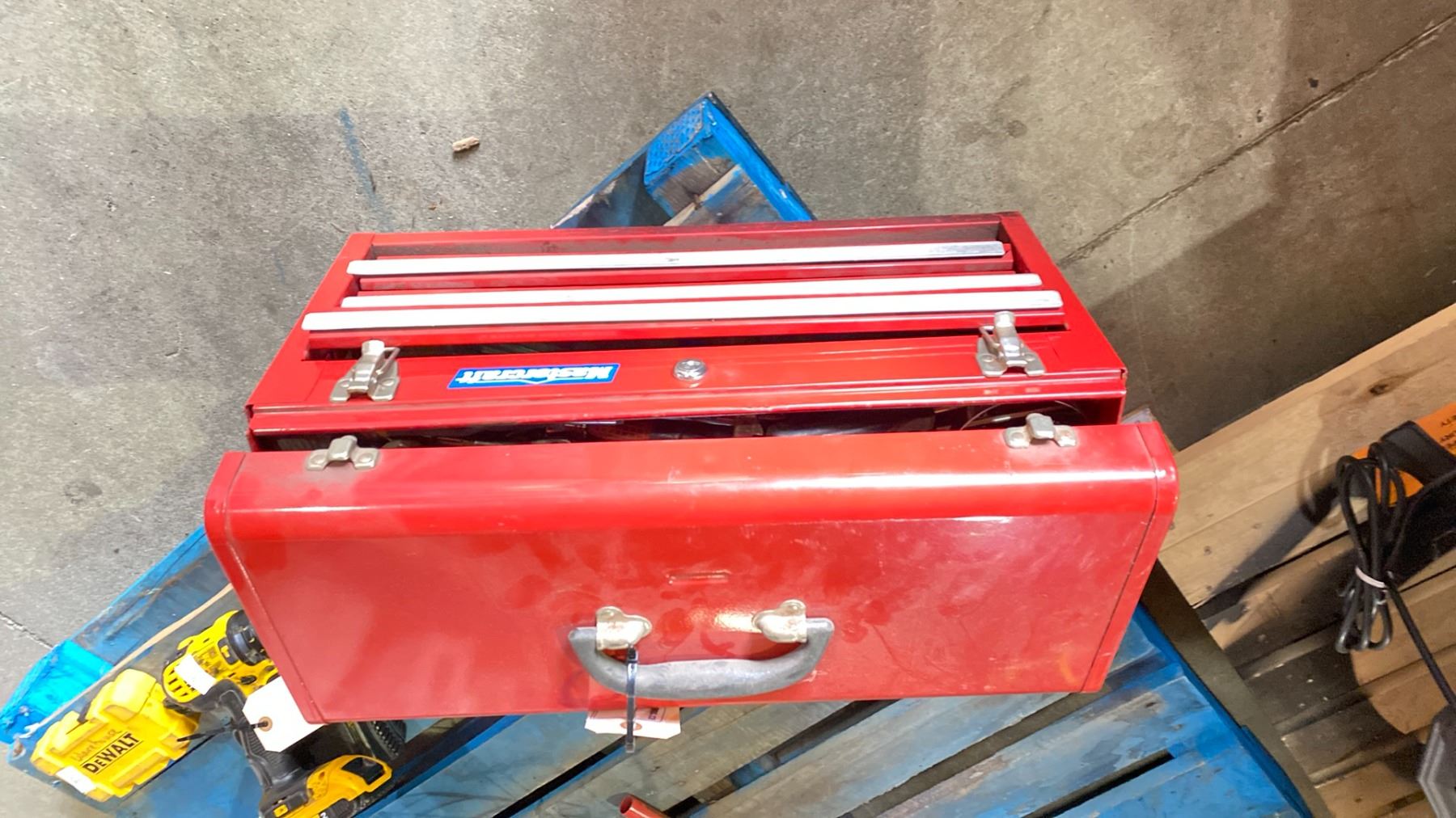 MASTERCRAFT RED METAL TOOLBOX WITH SCREW DRIVERS, DRILL BITS, ALLAN KEYS, WHEEL PULLER, ASST