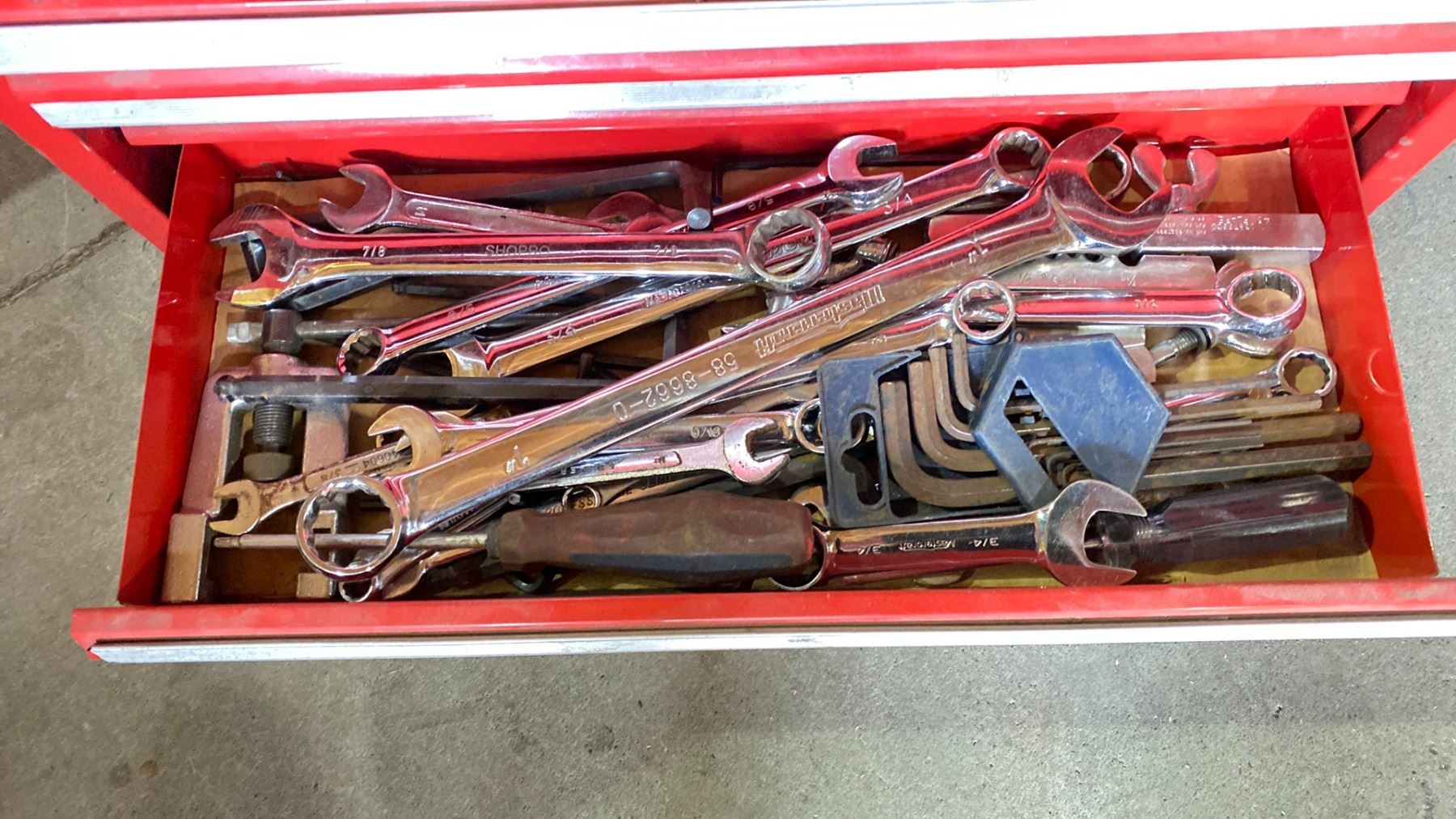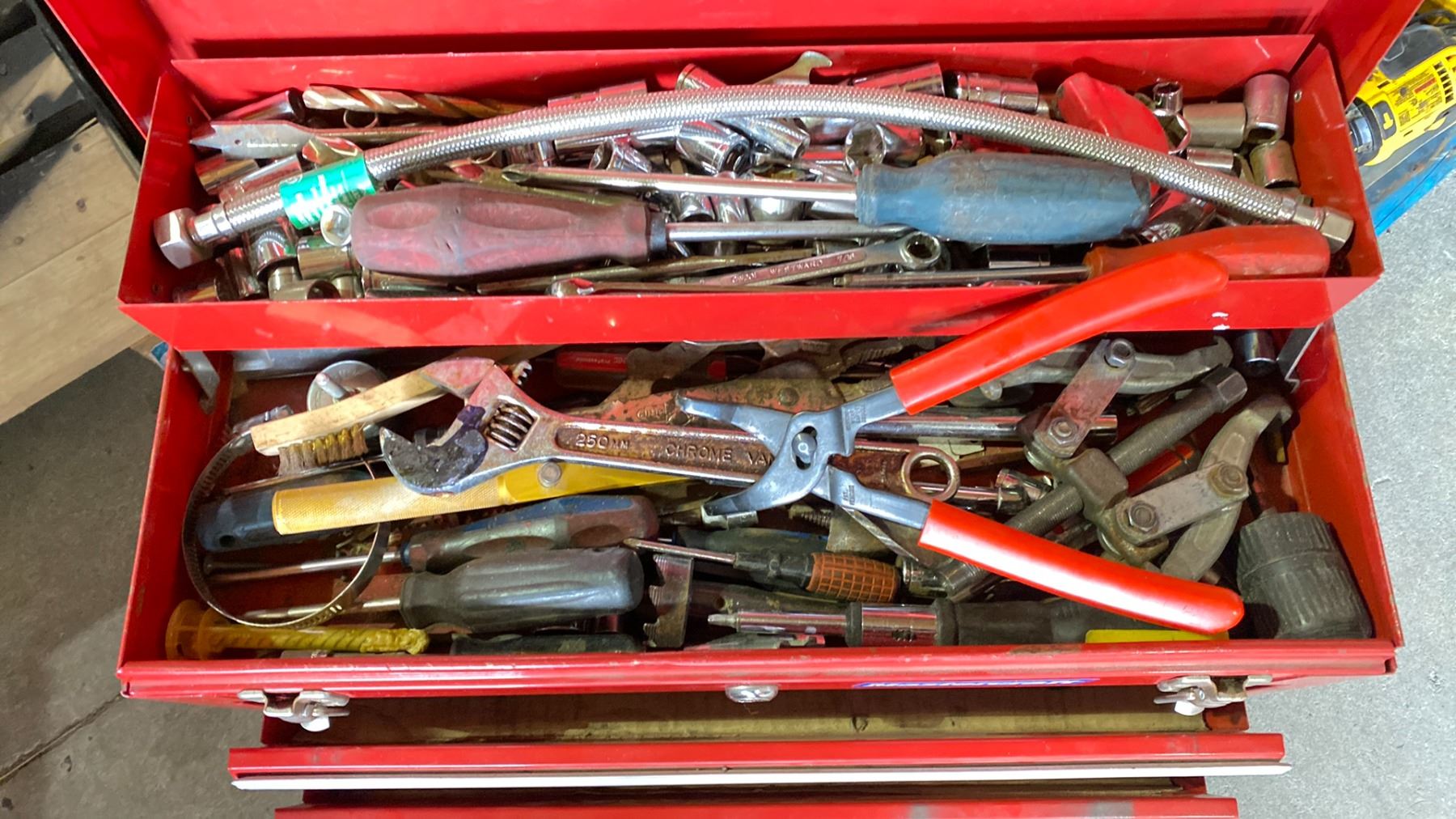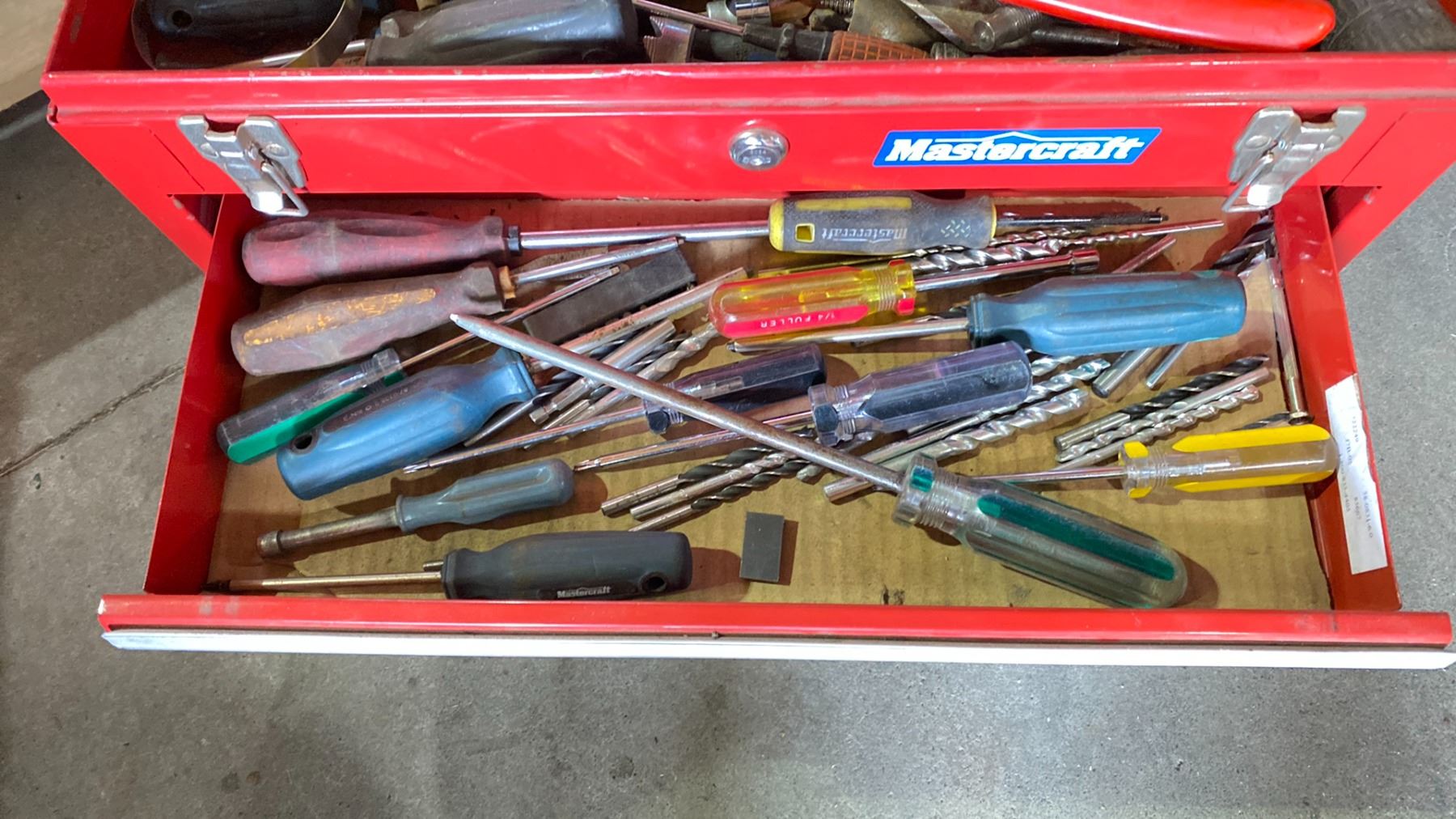 MASTERCRAFT RED METAL TOOLBOX WITH SCREW DRIVERS, DRILL BITS, ALLAN KEYS, WHEEL PULLER, ASST SOCKETS AND OTHER TOOLS