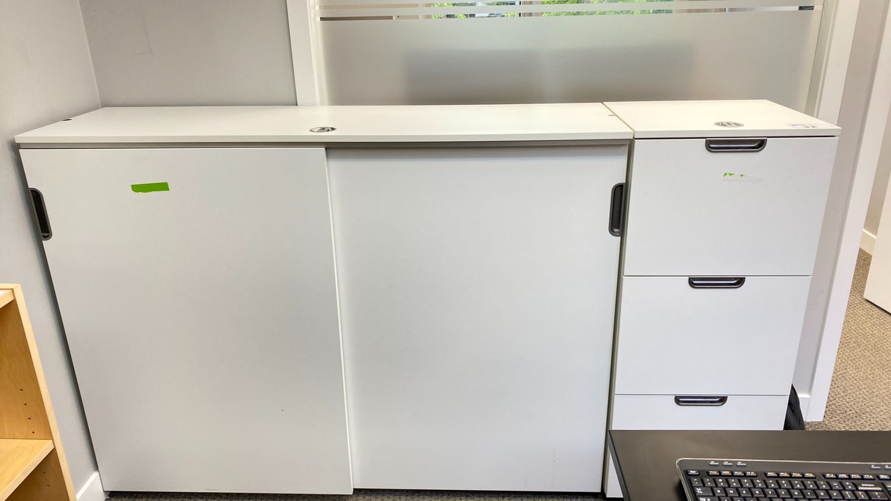 MATCHING SLIDING DOOR FILE CABINET AND VERTICAL FILE CABINET 63 X 18 X 47.5" & 20 X 18 X 47.5" COMBINATION LOCKS (COMBINATION UNKNOWN) CONTENTS NOT INCLUDED