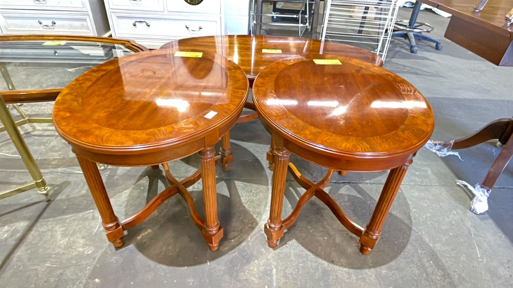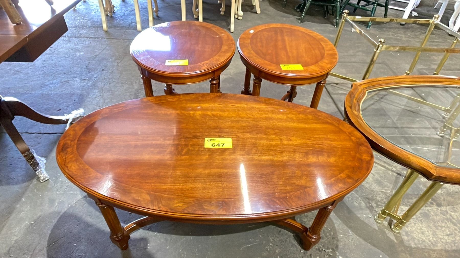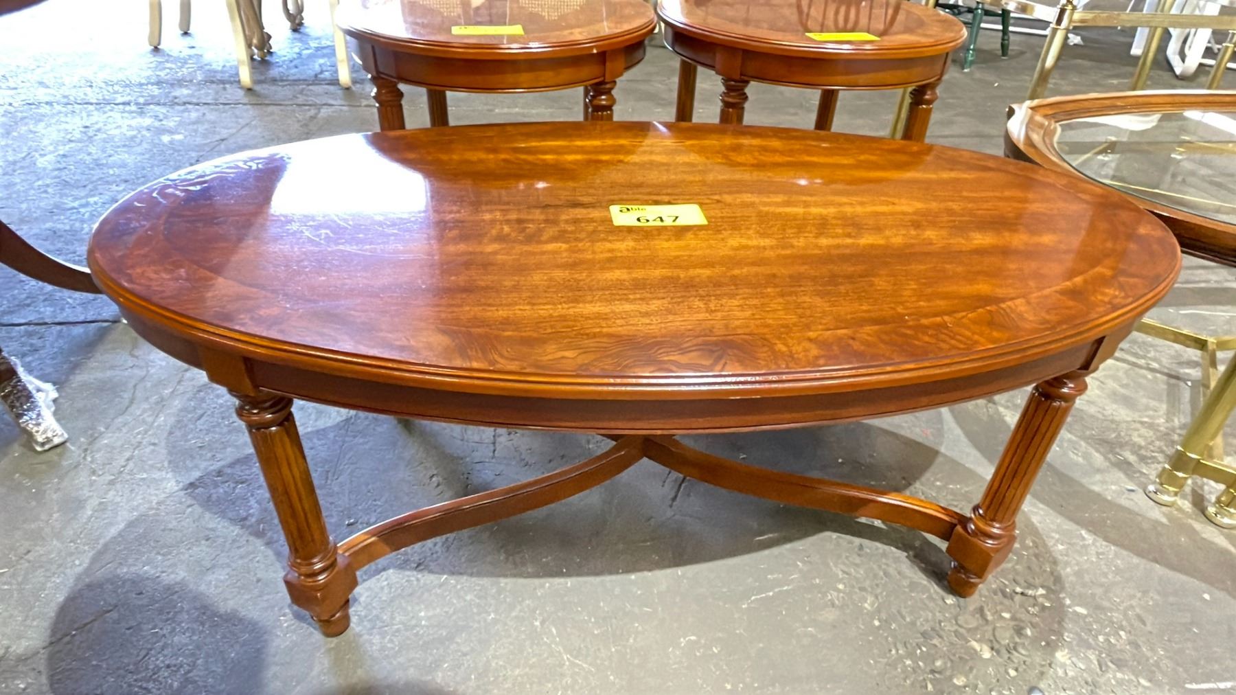 MATCHING WOOD OVAL COFFEE TABLE (45"L X 25"D X 17"T) & (2) OVAL SIDE TABLE WITH HIGH-GLOSS TOPS