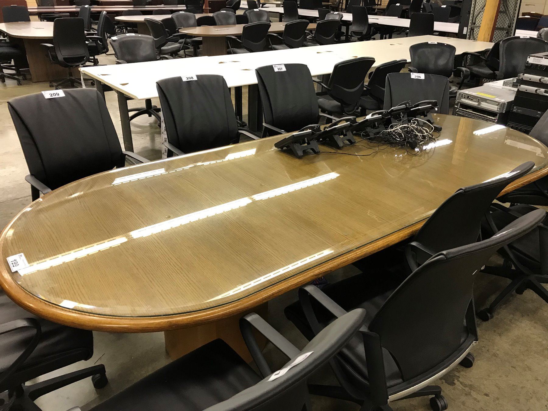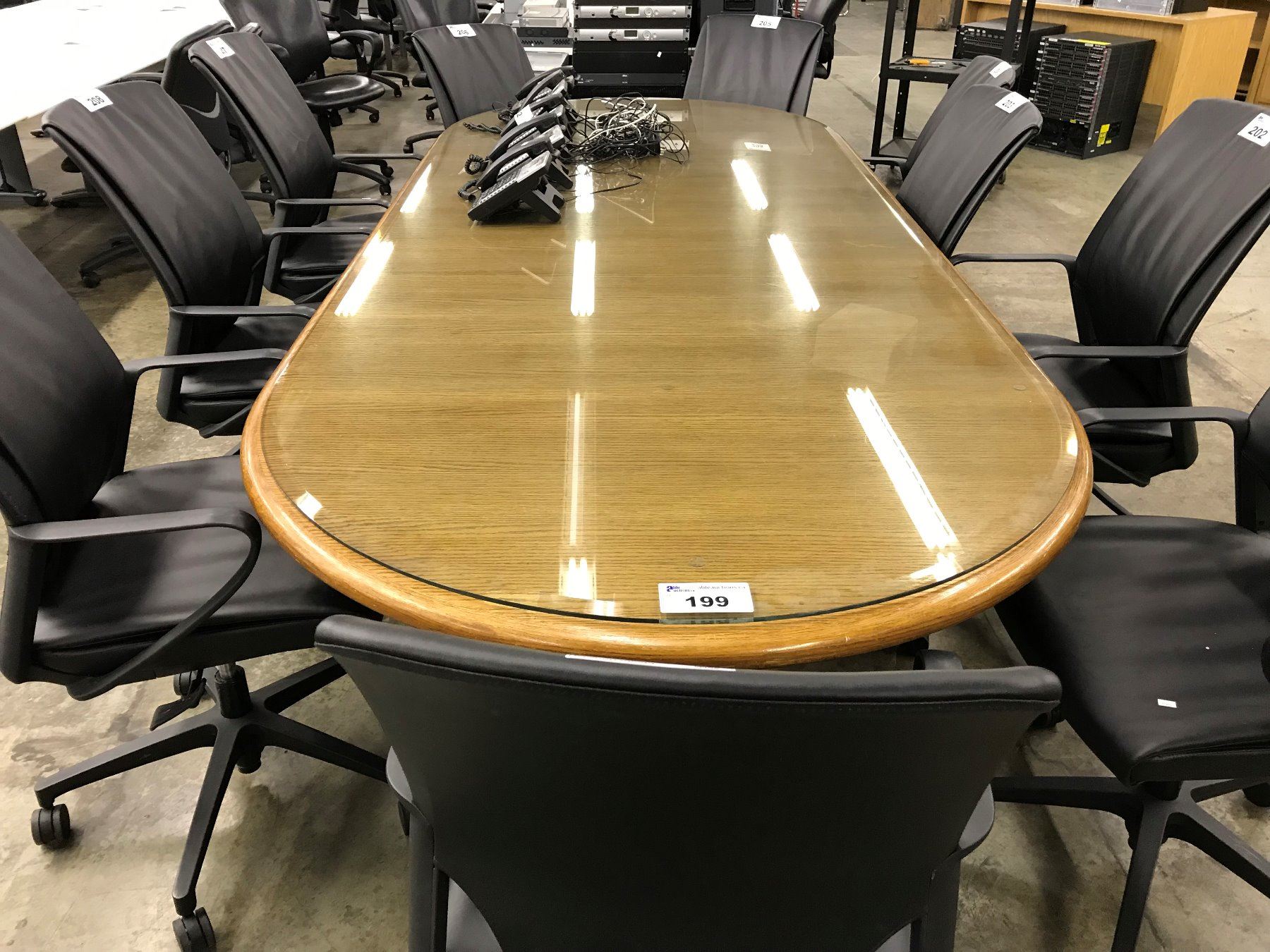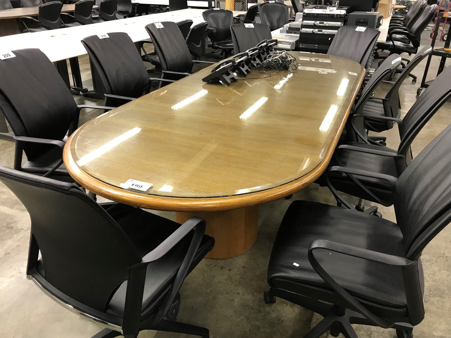 MEDIUM OAK 10' GLASS TOP RACETRACK BOARDROOM TABLE