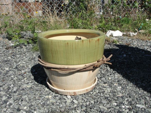 MEDIUM SIZE 2TONE GREEN AND OFF WHITE WITH TWIG DECORATIVE ACCENT SINGLE CERAMIC PLANTER