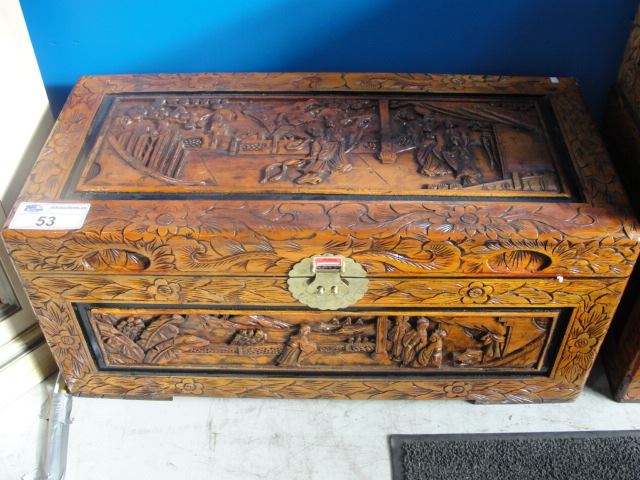 MEDIUM SIZE HEAVILY CARVED MAHOGANY ORIENTAL TRUNK