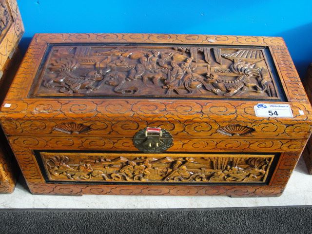 MEDIUM SIZE HEAVILY CARVED MAHOGANY ORIENTAL TRUNK
