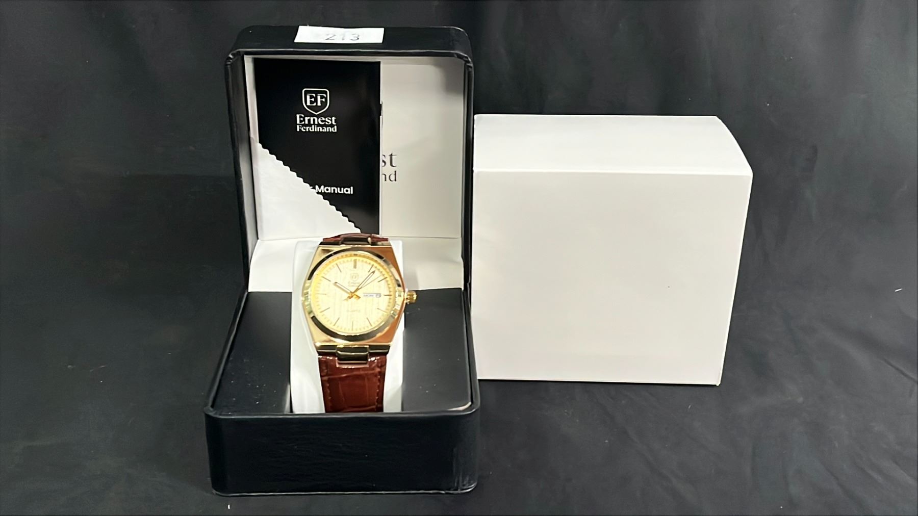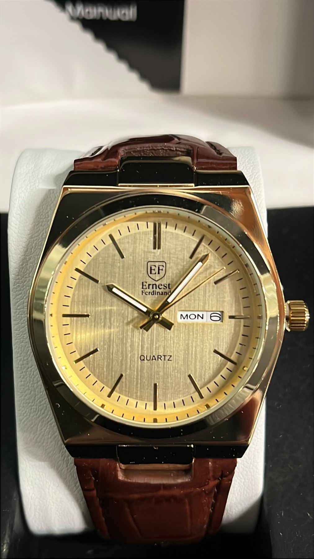 MEN'S ERNEST FERDINAND DAY/DATE WATCH WITH LEATHER STRAP IN BOX: 3ATM WATER RESISTANT