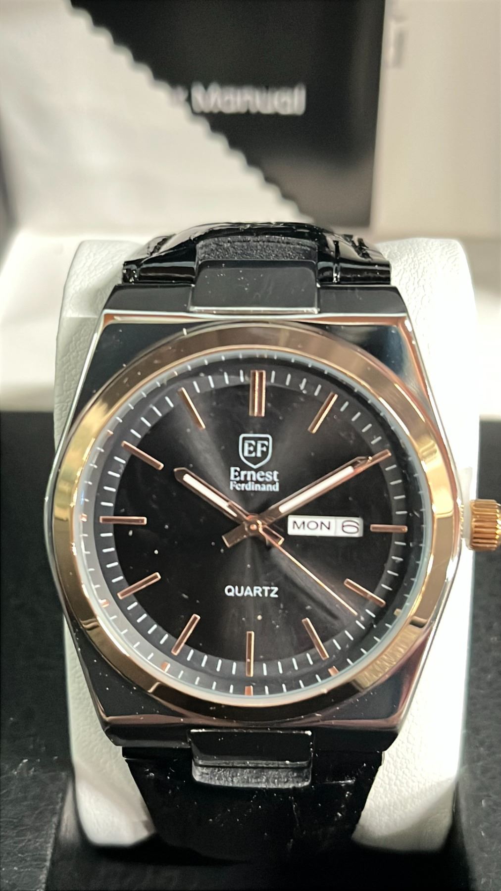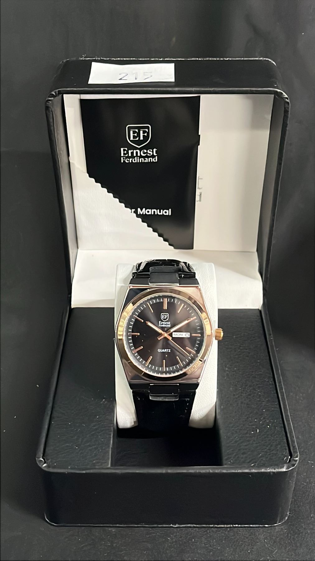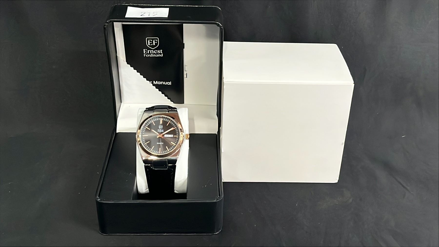 MEN'S ERNEST FERDINAND DAY/DATE WATCH WITH LEATHER STRAP IN BOX: 3ATM WATER RESISTANT