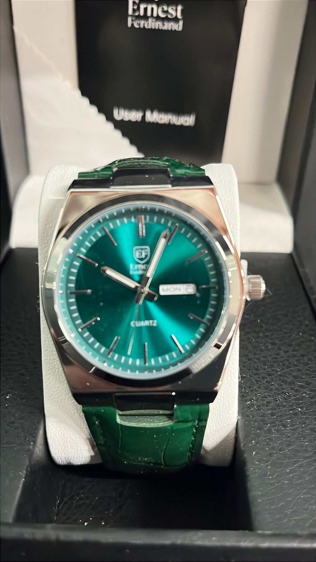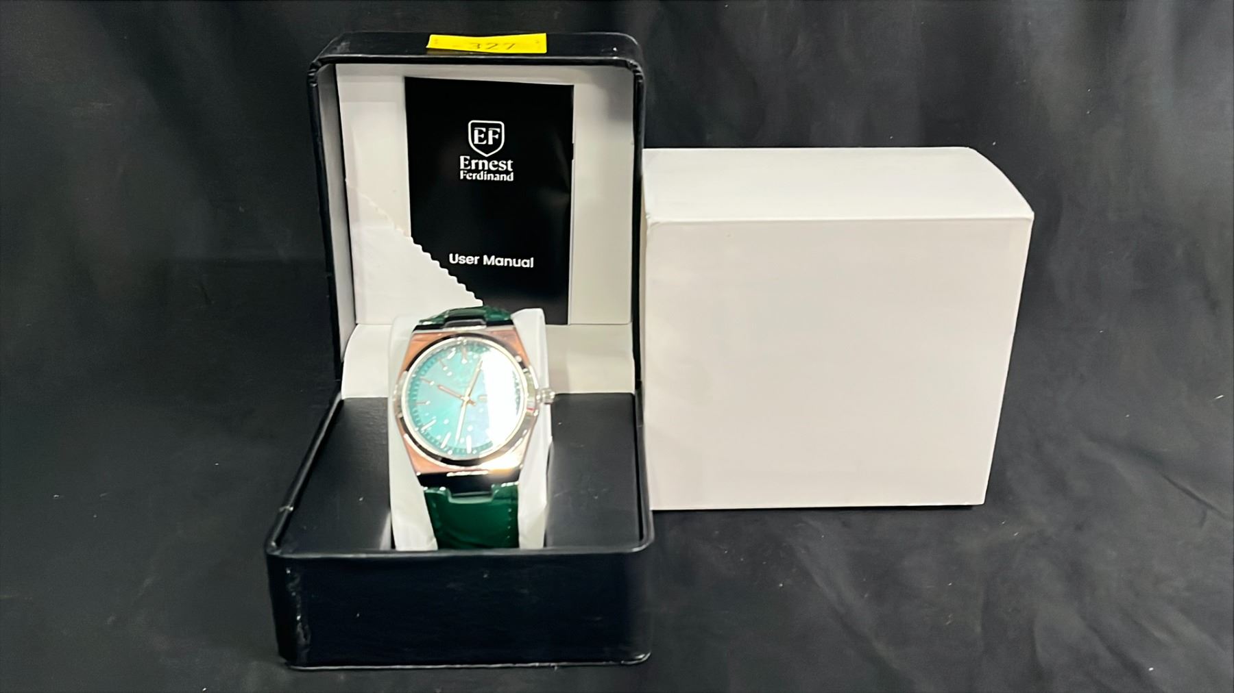 MEN'S ERNEST FERDINAND DAY/DATE WATCH WITH LEATHER STRAP IN BOX: 3ATM WATER RESISTANT