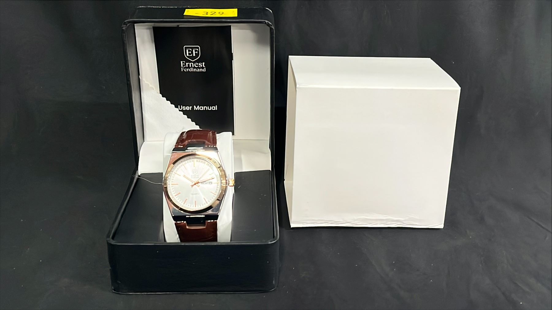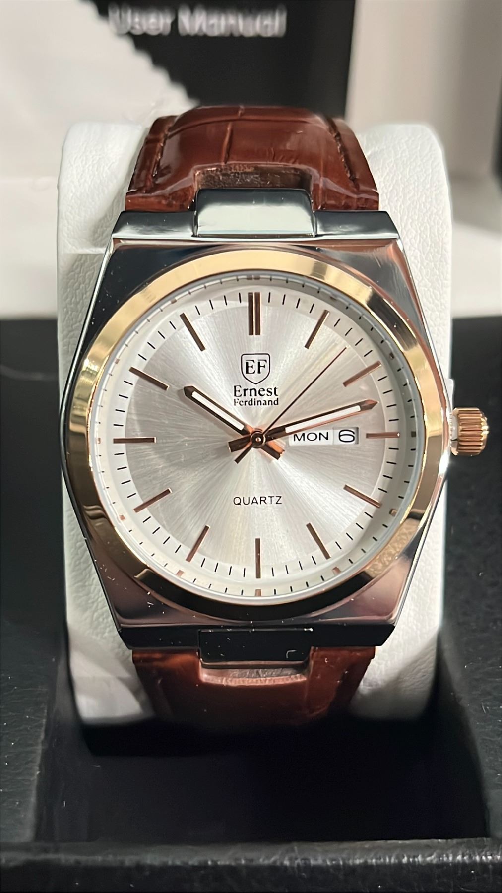 MEN'S ERNEST FERDINAND DAY/DATE WATCH WITH LEATHER STRAP IN BOX: 3ATM WATER RESISTANT