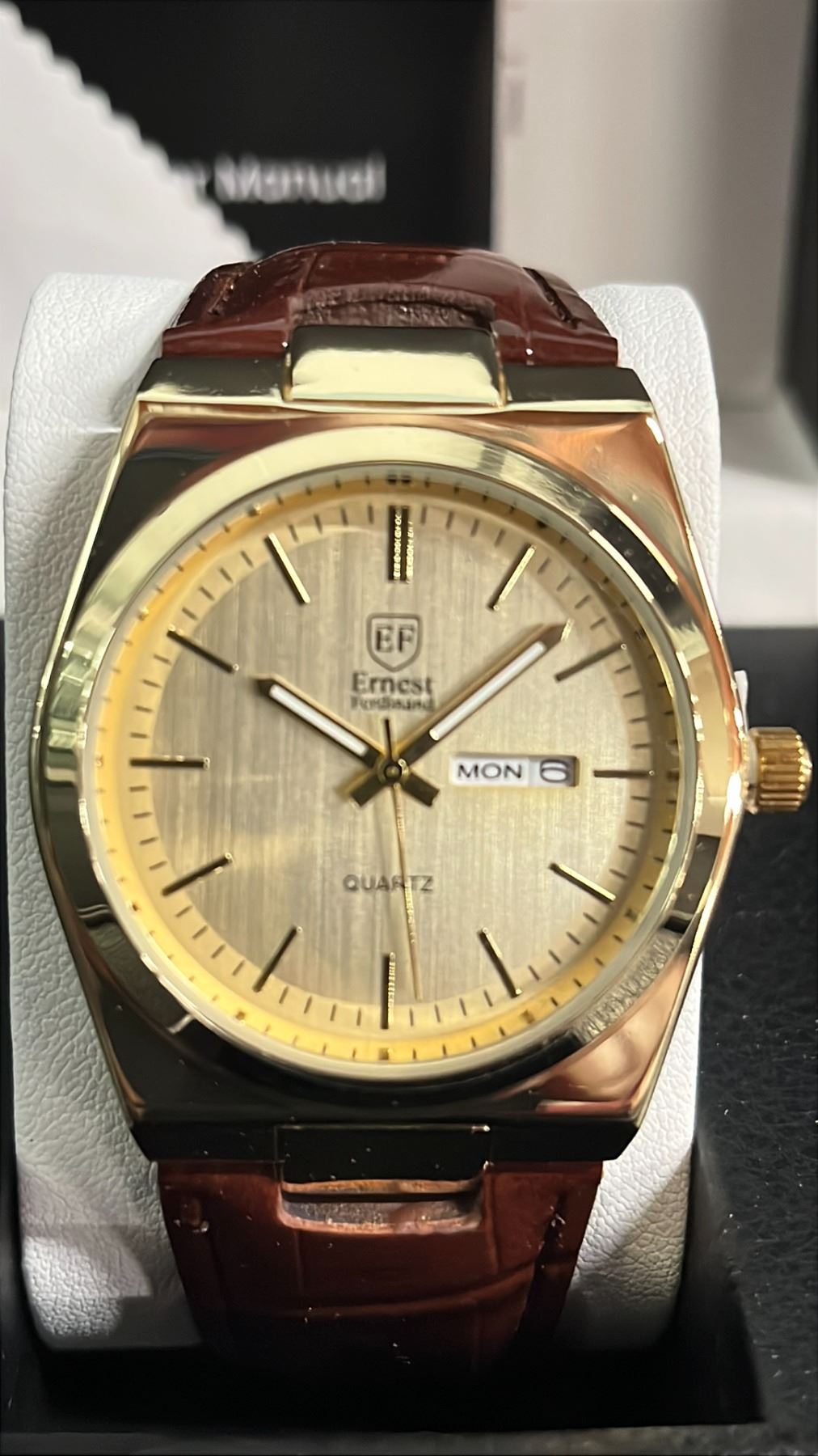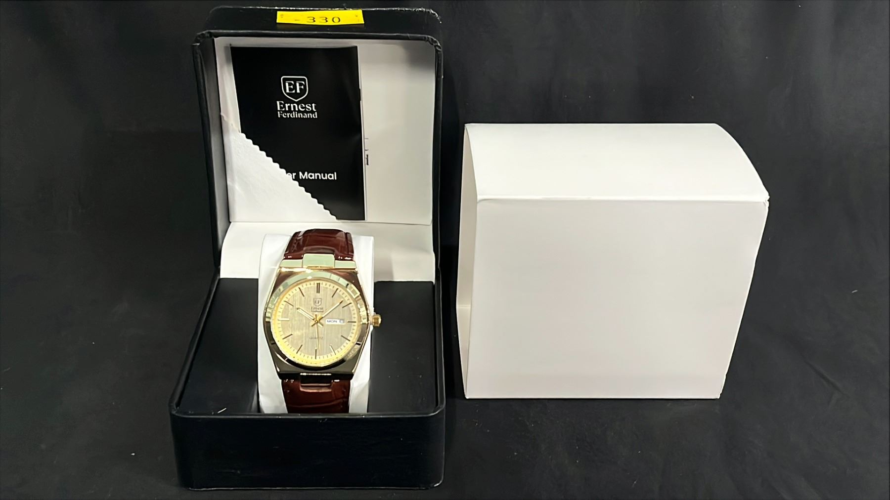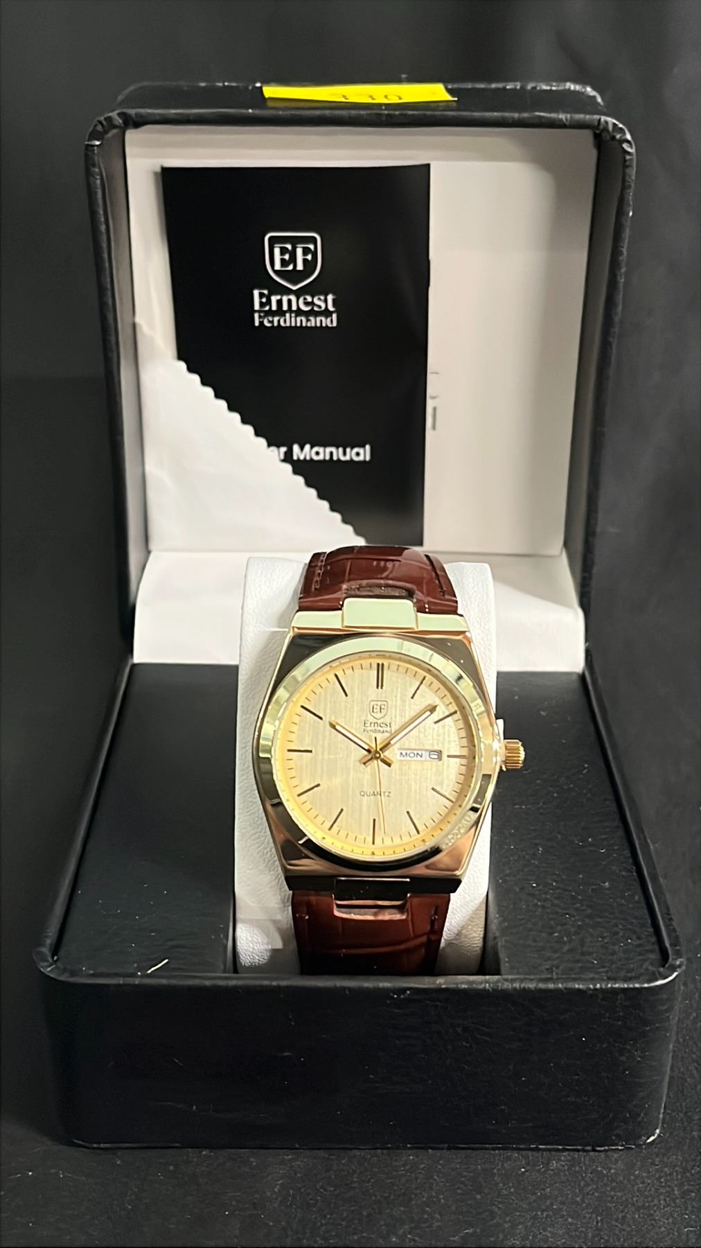 MEN'S ERNEST FERDINAND DAY/DATE WATCH WITH LEATHER STRAP IN BOX: 3ATM WATER RESISTANT